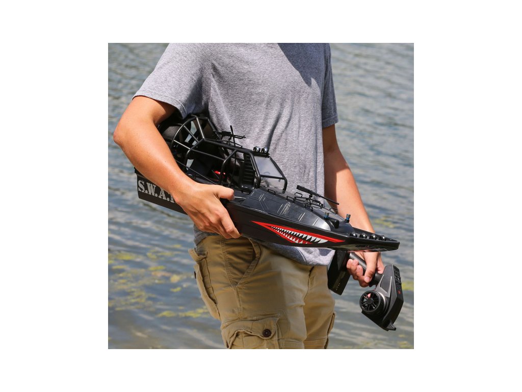 Unikátní RC model který umí jezdit na vodě, sněhu, ledu, v bažině i na trávě, to je Aerotrooper 25" s výkonným střídavým motorem. Díky plochému dnu klouže na různých površích, kormidla za vrtulí řídí směr a proto projedete s lodí téměř všude. Kamufláž lze dotvořit sadou obtisků. RC souprava STX2 2,4GHz.