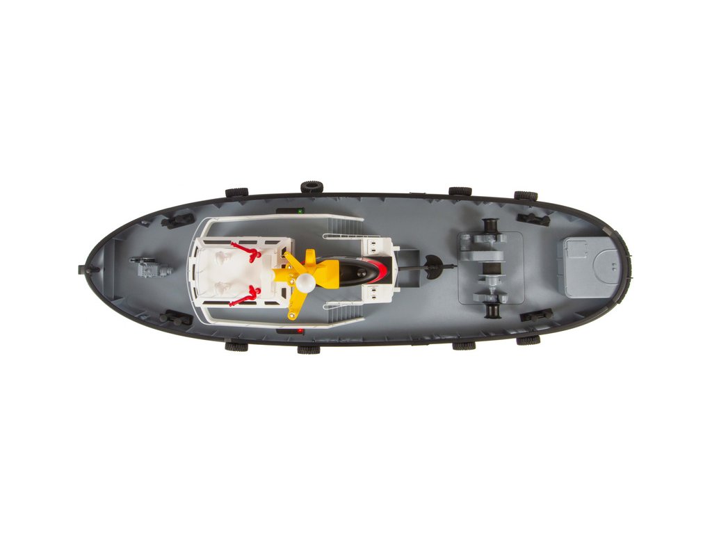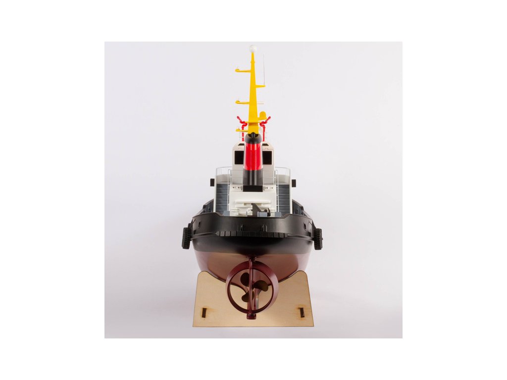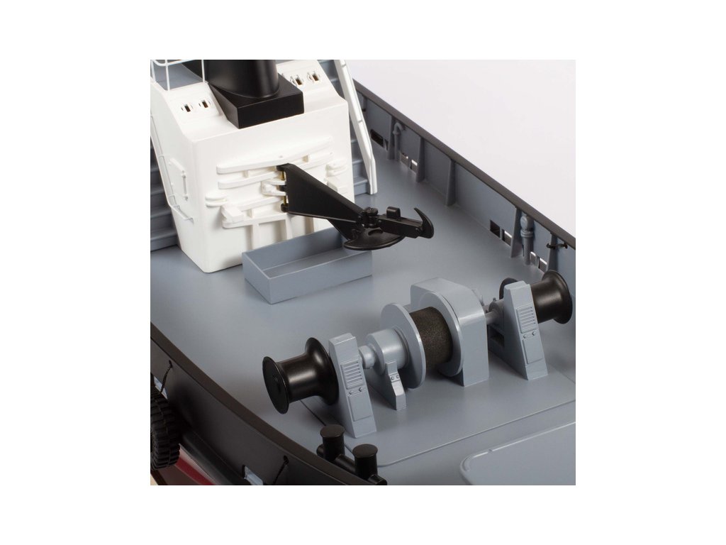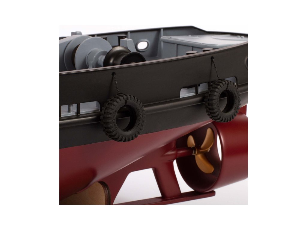 RC model lodi Tug Boat je realisticky zpracován, těšit se můžete na nárazníkové pneumatiky, zadní palubu s navijákem a jeřábem, nebo schody na můstek se zábradlím.