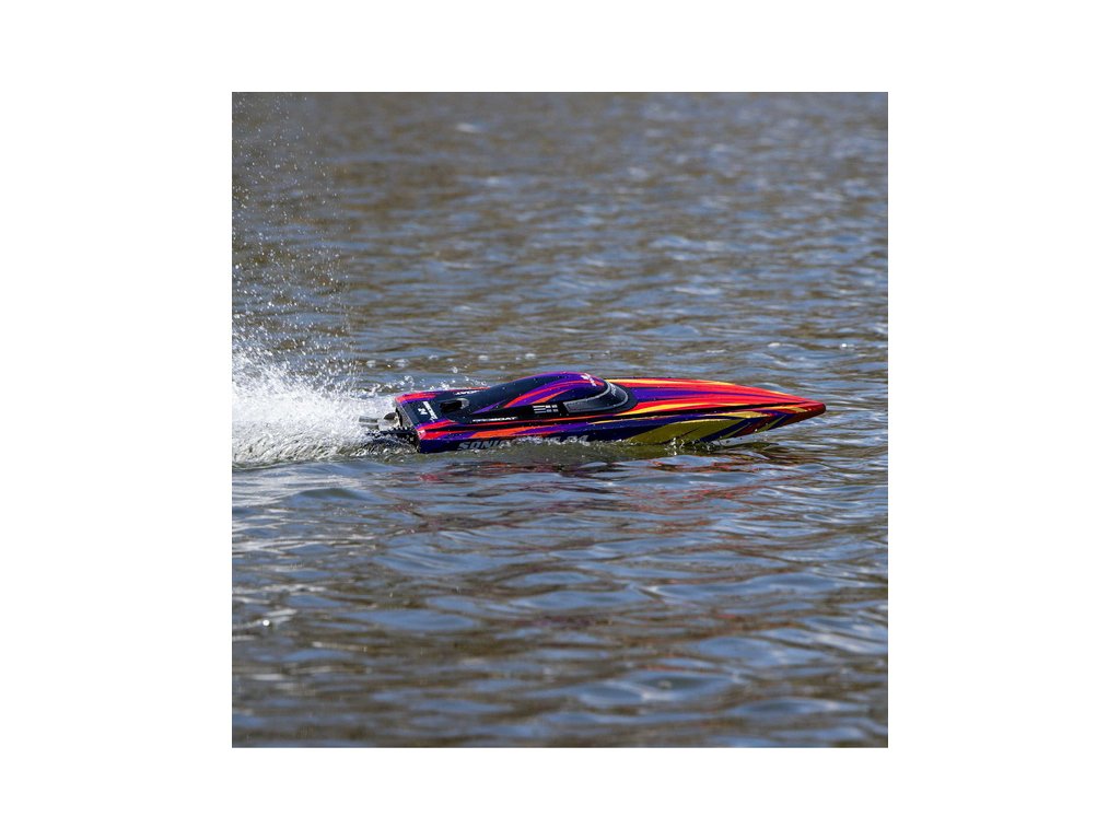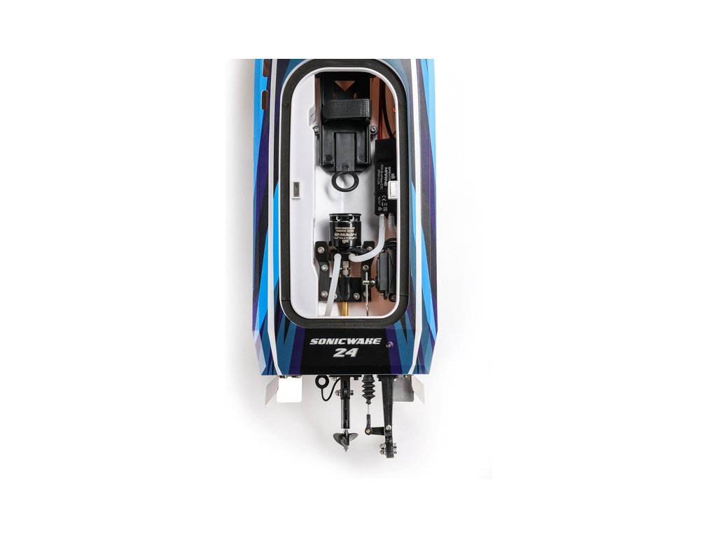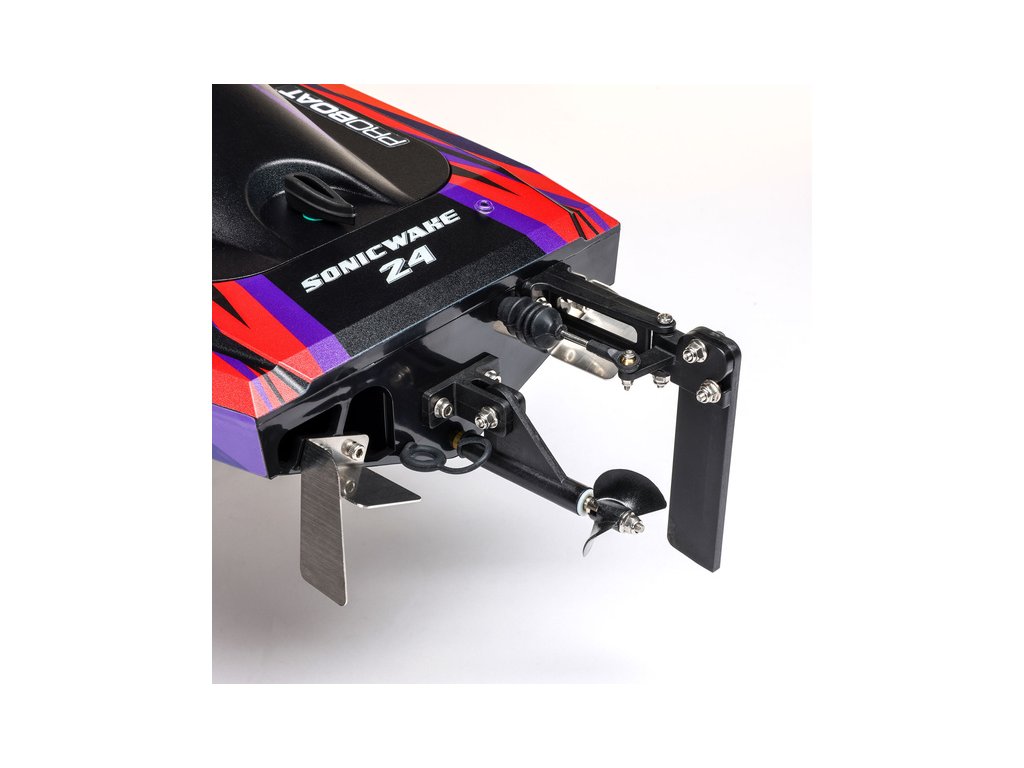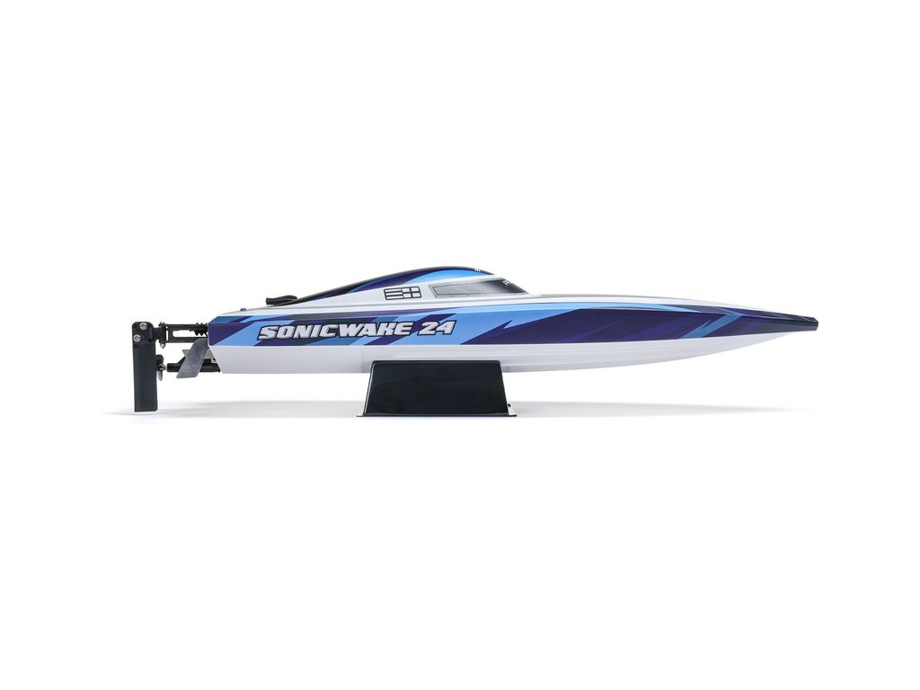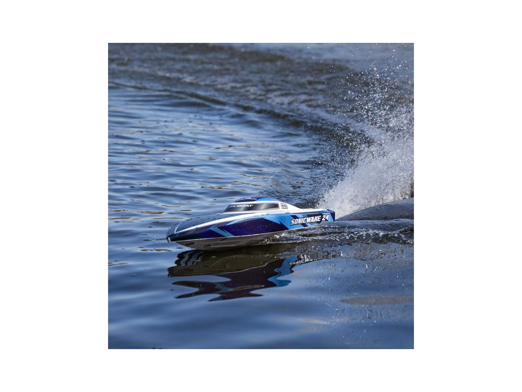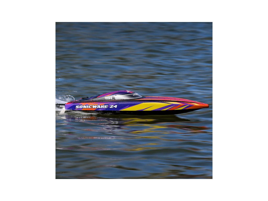 Rychlostní člun střední velikosti Proboat Sonicwake 24" s exkluzivní funkcí automatického otočení (Self-righting). Instalován je vodou chlazený střídavý motor 2500Kv a regulátor Spektrum 50A pro rychlost až 56 km/h. Vše potřebné je v balení - vč. akumulátoru 3S LiPo a USB nabíječe.