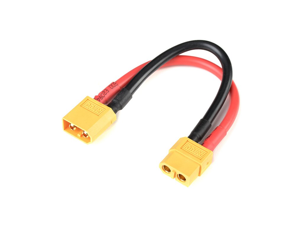Prodlužovací kabel s konektory XT-60 baterie a přístroj (samice a samec), kabel 12AWG o délce 12cm.