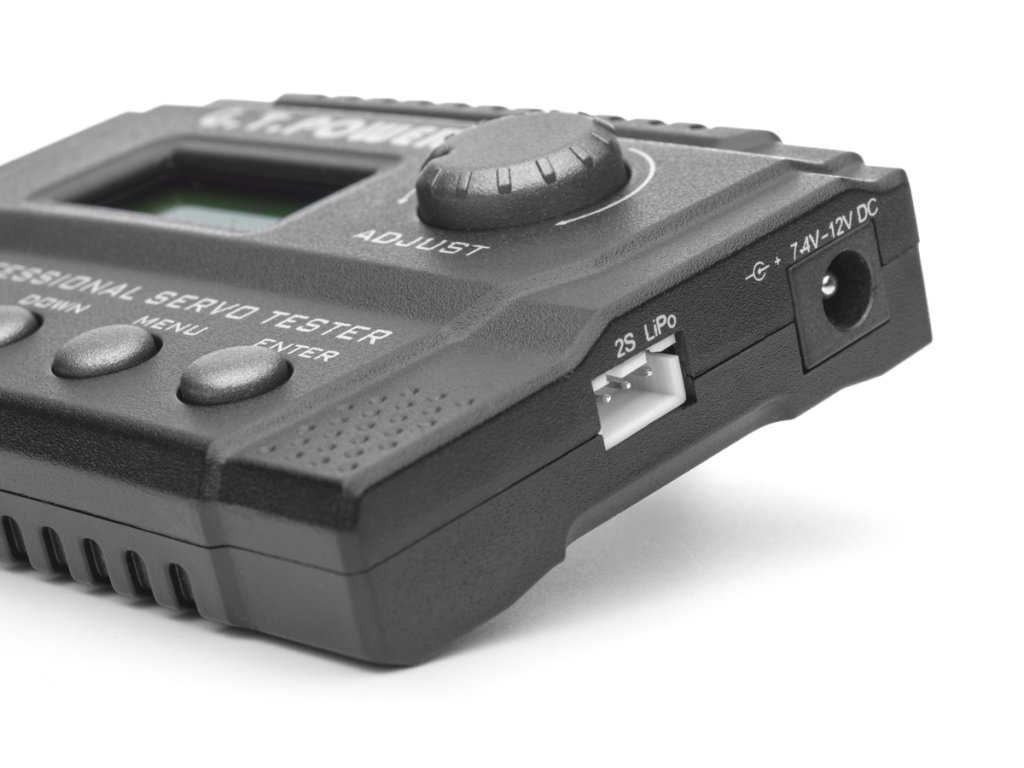Pro napájení servotesteru slouží zásuvky na pravém boku – buď zásuvka JST-XH pro připojení servisního konektoru 2S LiPo akumulátoru (7,4 V), nebo souosý konektor pro připojení akumulátoru nebo síťového zdroje s napětím 7,4-12 V. Napájecí napětí pro servo na výstupu servotesteru (SIGNAL/OUT) je stabilizováno na 5 V bez ohledu na velikost napájecího napětí přístroje.
