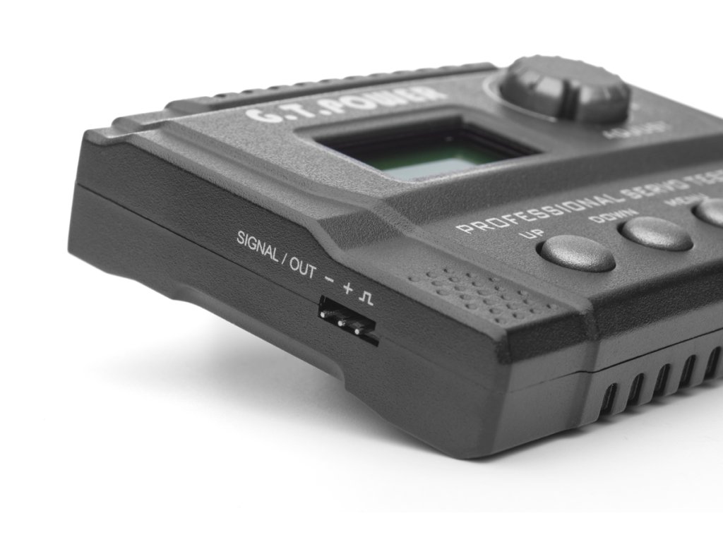 Testované servo se připojuje do zásuvky SIGNAL/OUT na levém boku. Do stejné zásuvky se přivádí řídící signál z vnějšího zdroje při měření šířky impulsů v režimu „PW MODE“.