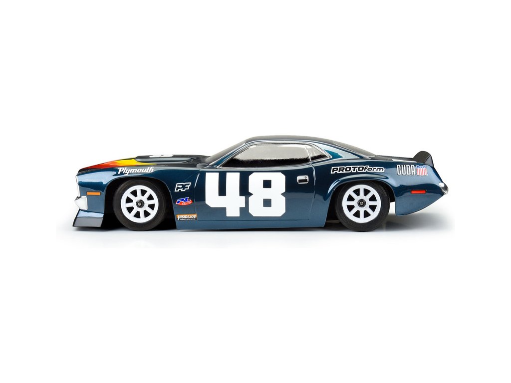Karosérie Protoform 1970 Plymouth Barracuda čirá, pro RC modely aut 1:10, délka 450mm, šířka 200mm, výška 108mm, rozvor 260 mm. Vyrobeno z odolného lexanu, obsažen arch samolepek. Vraťte se do slavných časů amerických silničních závodů s karoserií legendárního vozu.