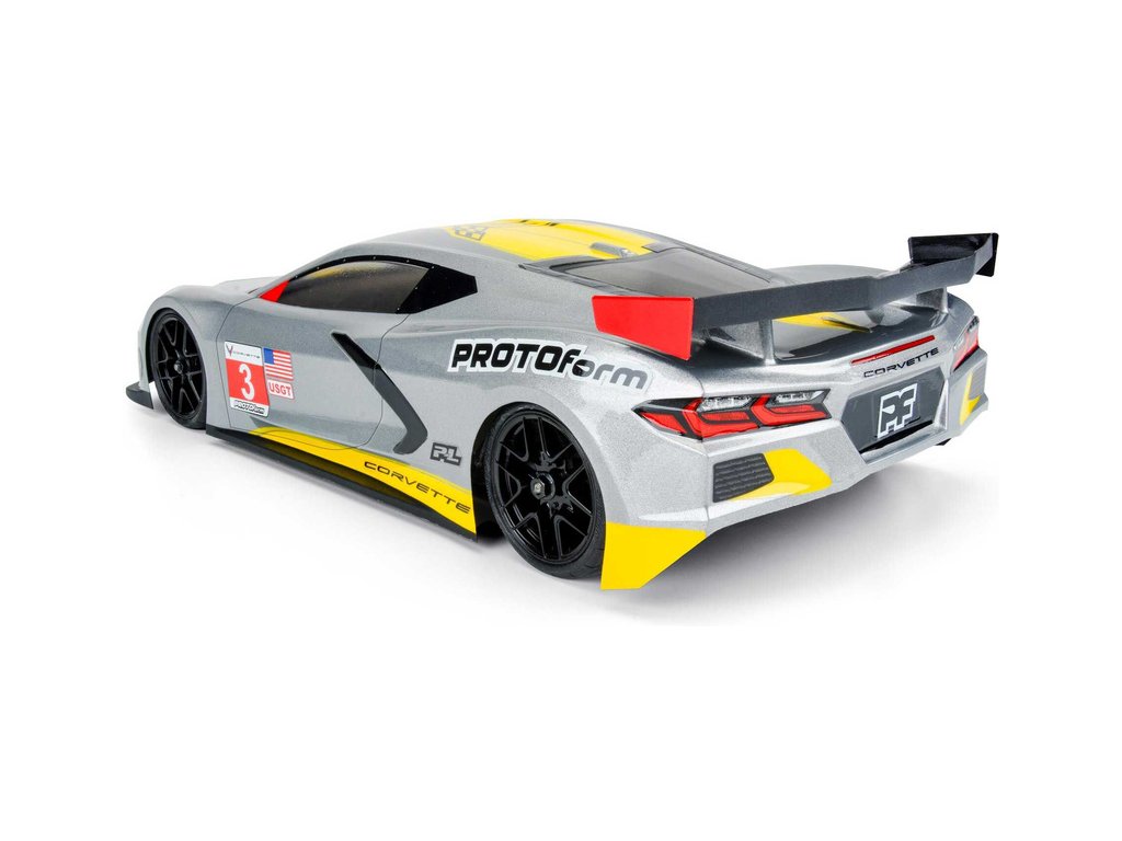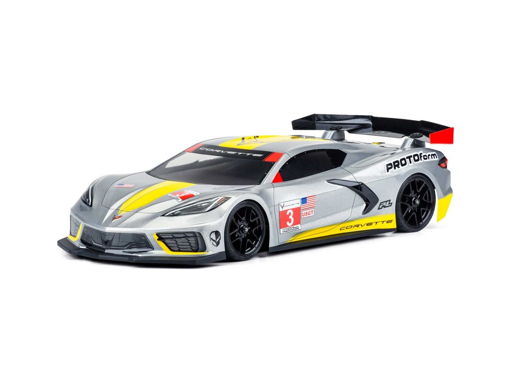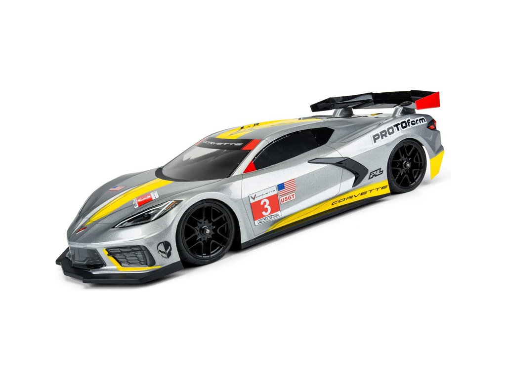 Karosérie Protoform Chevrolet Corvette C8: 190mm Touring Car čirá, pro RC modely aut 1:10, rozvor 257mm, délka 449mm, šířka 193mm. Vyrobeno z odolného lexanu, montážní příslušenství.
