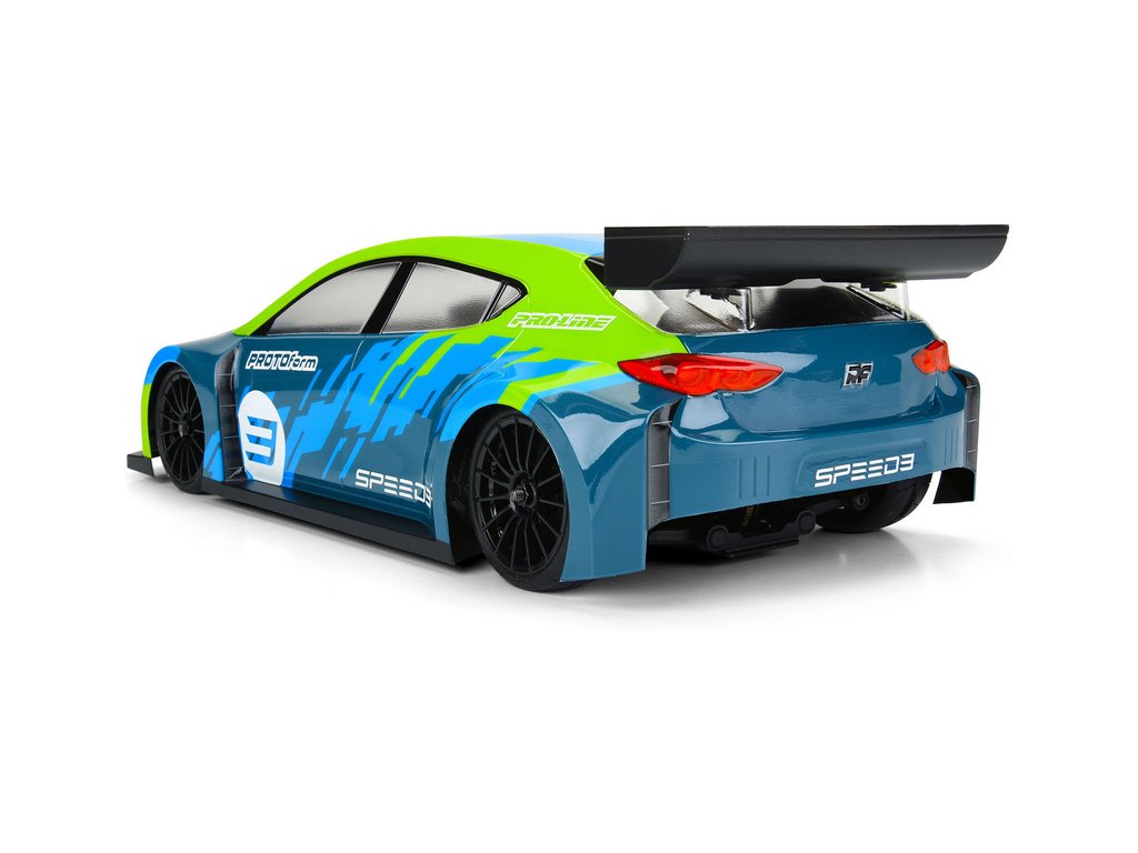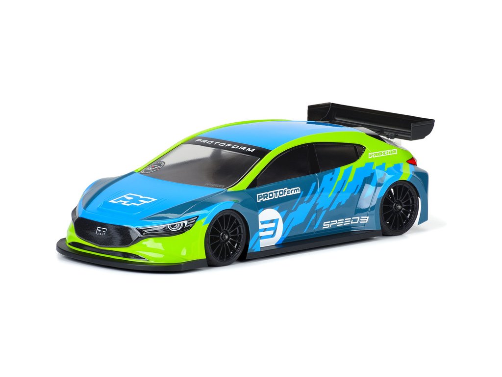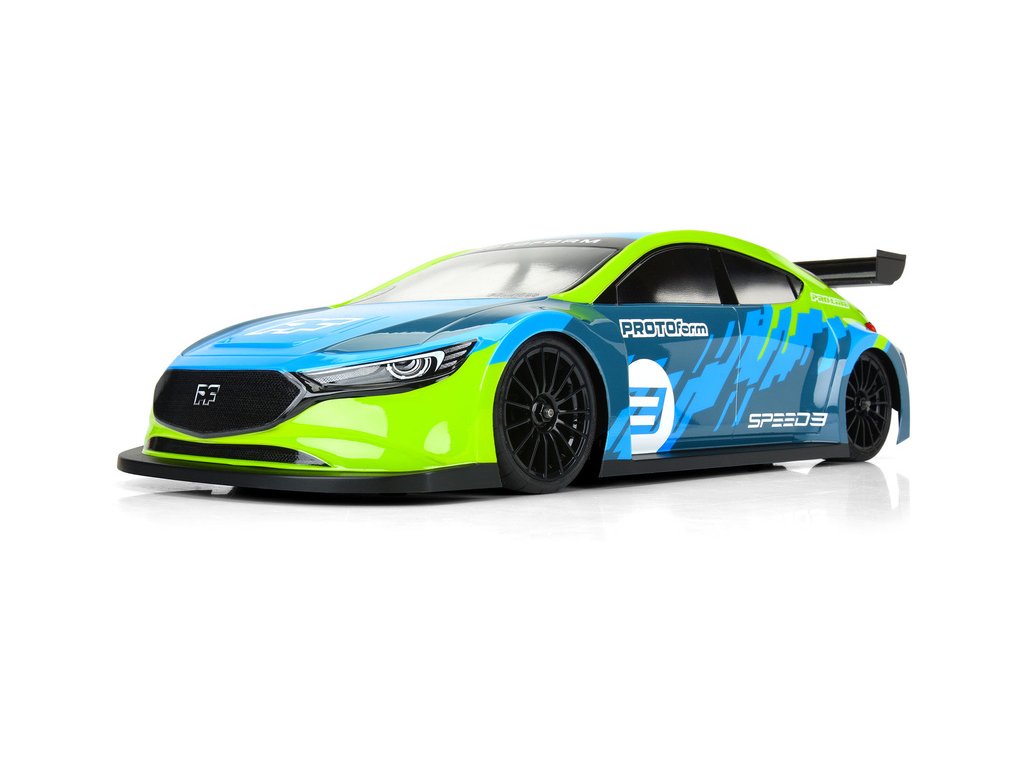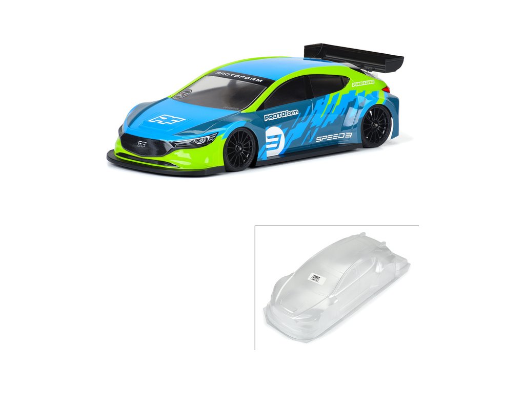 PROTOform karosérie 1:10 Speed3 (190mm FWD TC) je nejnovější aerodynamické řešení PROTOform pro vysoce soutěžní závody elektrických cestovních vozů s pohonem předních kol 1/10, Speed3. Speed3 přebírá styl populárních japonských Hot Hatch, soutěžících v plnohodnotných třídách TCR po celém světě, s agresivními lemy blatníků a skloněnou linií střechy hatchbacku.Karosérie splňuje nová pravidla FWD Global Body Spec a je schválena pro soutěž EFRA. Rozvor 257mm.