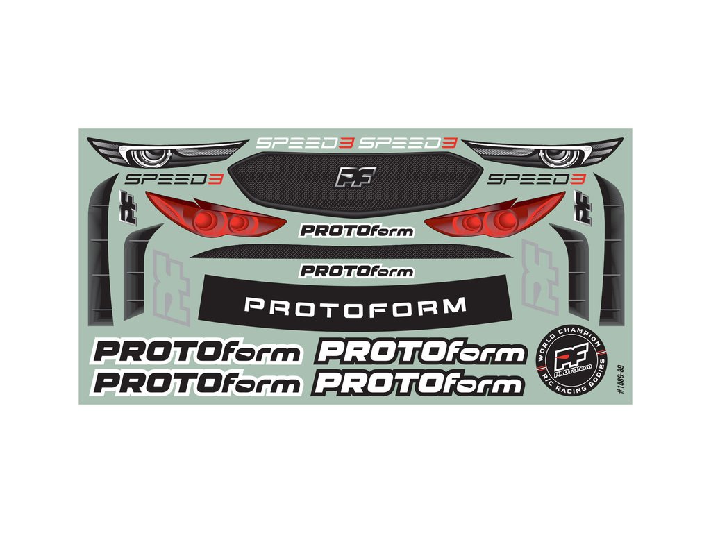 Speed3 se vyznačuje dosud nejjednodušší montáží karosérie PROTOform. Je opatřena charakteristickými montážními značkami PROTOform uvnitř podběhů předních kol, které vám umožňují volit polohu karosérie v krocích po 2 mm až do +8 mm. Kromě toho jsou na kapotě a zadním nárazníku sady značek, pro snadné zarovnání sloupků karoserie. Je vyrobena v USA z vysoce kvalitního, super odolného 0,7mm polykarbonátu. Balení doplňuje stylový obtiskový arch, masky na okna a přestřikovací fólie.