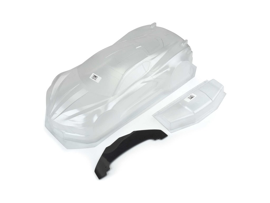 Karosérie Protoform Chevrolet Corvette C8 čirá pro RC modely aut 1:7, rozvor 257mm, délka 692mm, šířka 335mm. Vyrobeno z odolného lexanu, montážní příslušenství.
