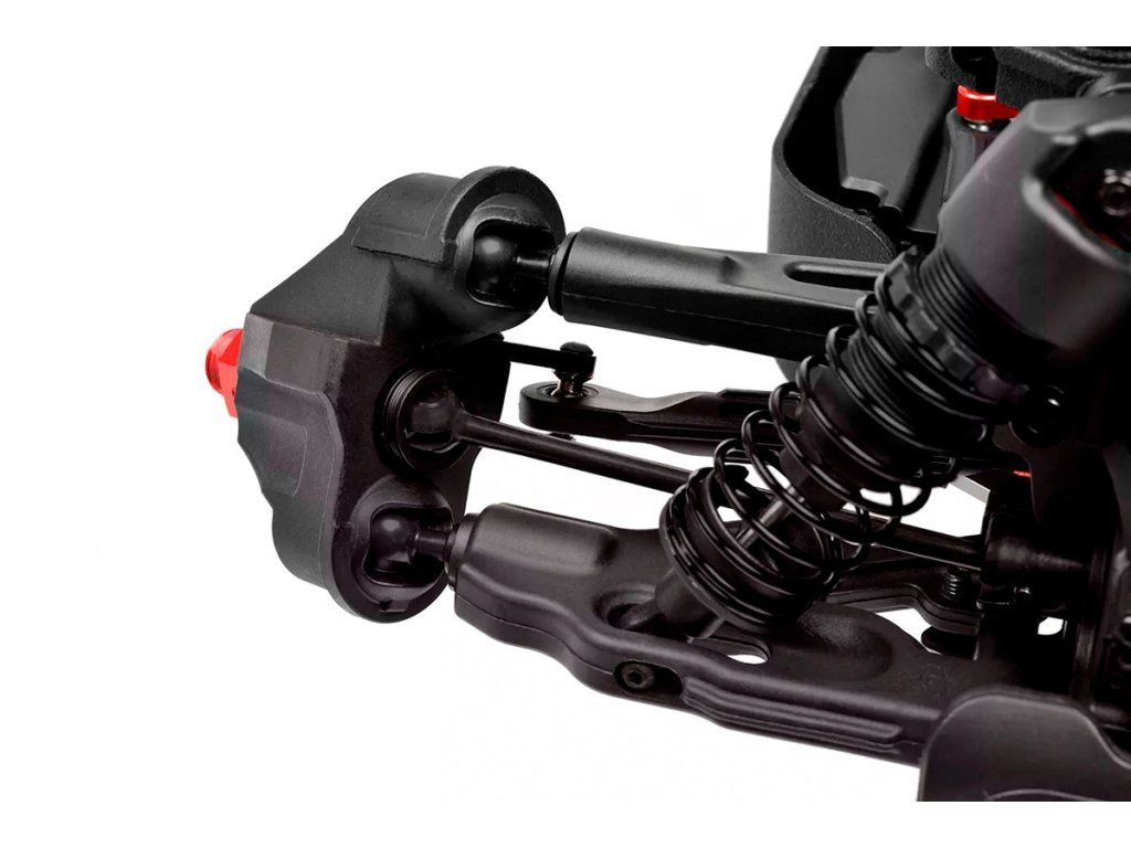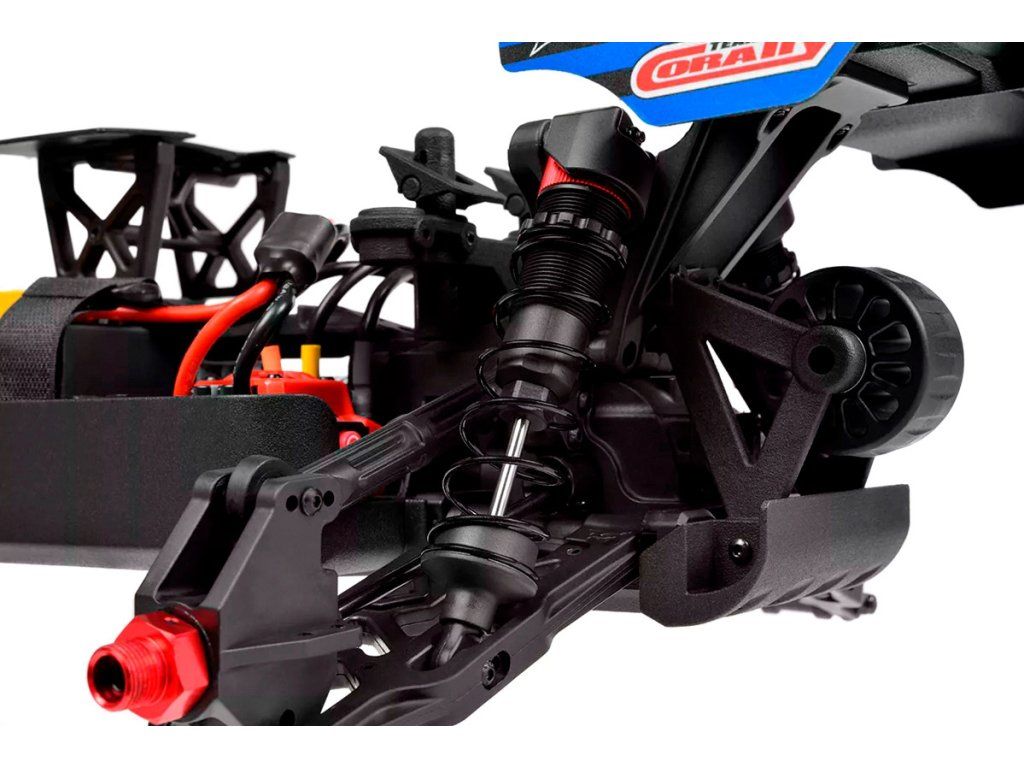 Jeho hybridní hliníkový držák motoru nabízí tři polohy motoru pro přesné nastavení vůle pastorku. Zesílené hnací ústrojí s ocelovými unašeči a robustním hlavním převodovým převodem 52T zajišťuje dlouhou životnost. Široké těhlice z Kagamy a Sketeru dodávají stabilitu a schopnosti v terénu, zatímco nové wheelie kolečko pomáhá zvládat obrovský výkon. Od střídavého motoru Kuron 725 až po regulátor Torox 135 - každá součástka přispívá ke vzrušující maximální rychlosti přes 80 km/h. Vysílač CT2S 2,4 GHz, systém vyztužení podvozku a křídlo s vysokou přítlačnou silou doplňují balíček, takže Punisher4 je skutečným důkazem odkazu inovací a výkonu firmy Team Corally.