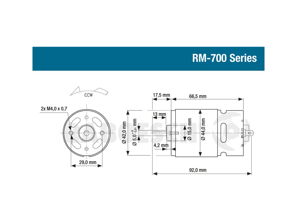 Raboesch motor stejnosměrný Blue RM-730 TRQ 12V s vysokým točivým momentem ve velikosti 700. Napájení 6-12V, průměr hřídele 5mm, hmotnost 352g. Proud při maximální účinnosti 2,3A, otáčky při maximální účinnosti 3820 ot/min.