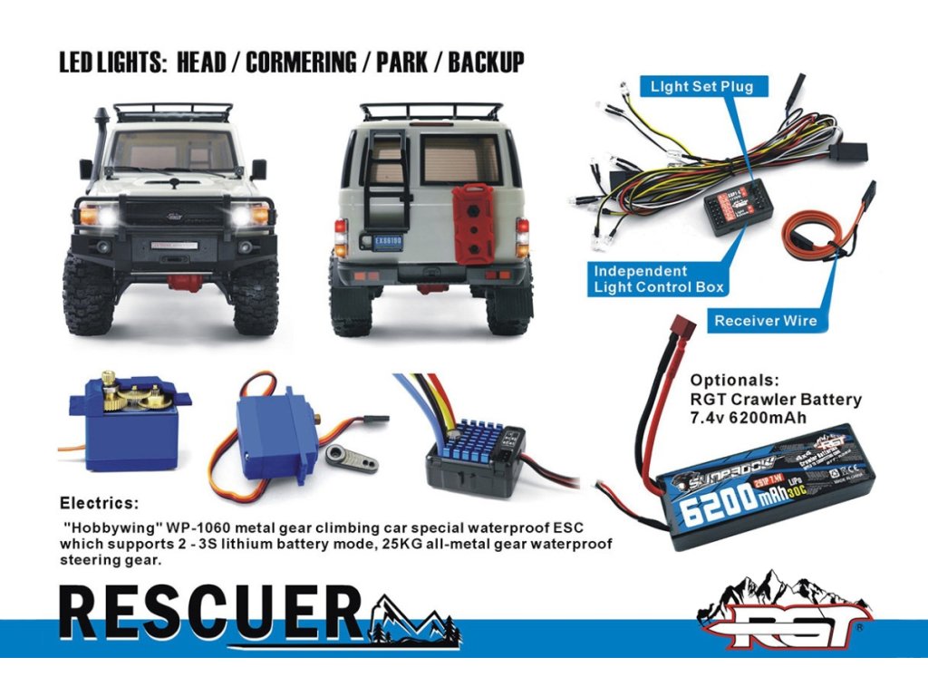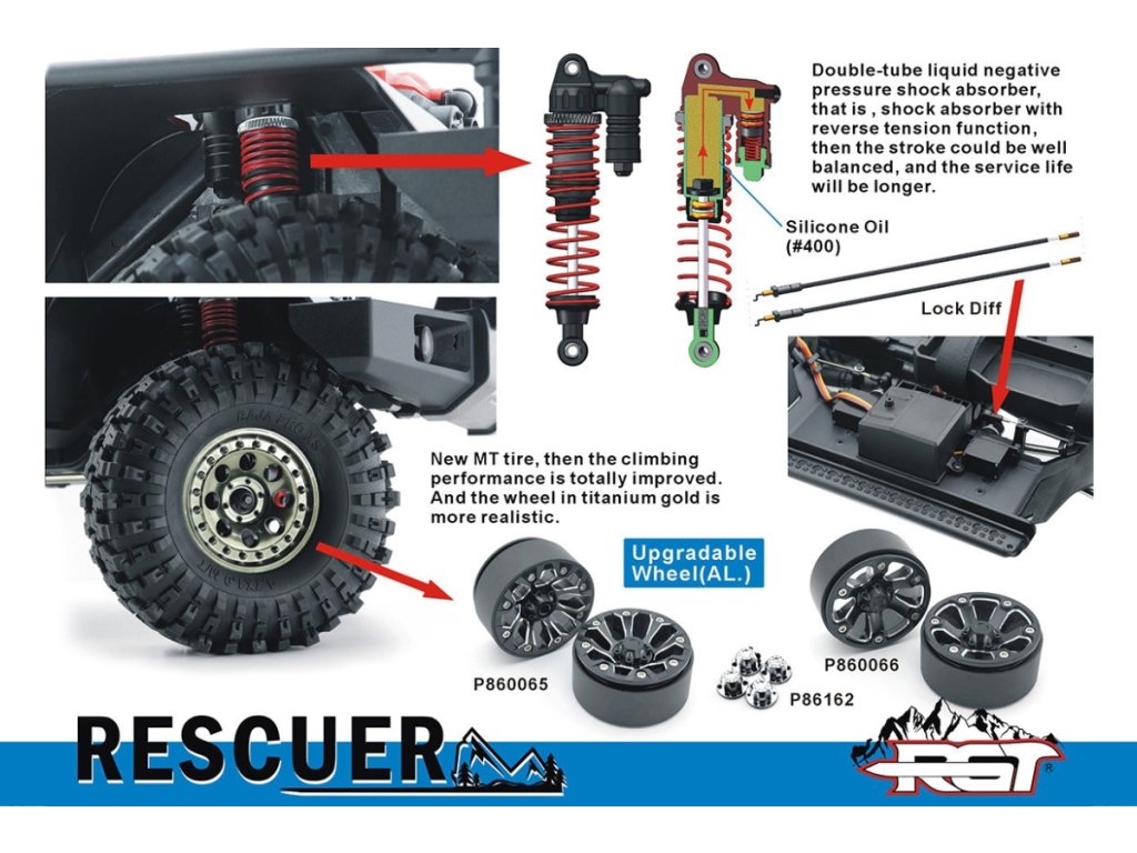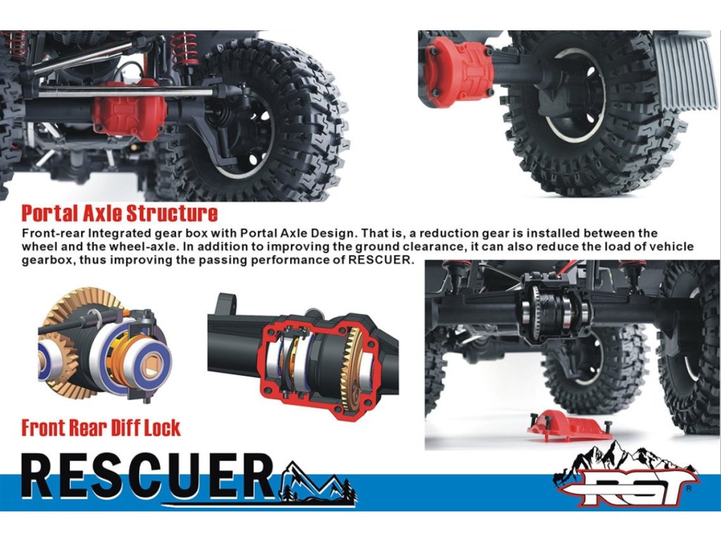 Rescuer má pevný rám podvozku, rozvor 324mm, 2rychlostní převodovku s reverzní rotací, maximální úhel zatáčení 42 stupňů, portálové nápravy s uzamykatelnými diferenciály, kovové převody, nastavitelné kovové "piggyback" tlumiče s dvojími pružinami, kvalitní utěsněná ložiska, nebo kovové CVD poloosy.