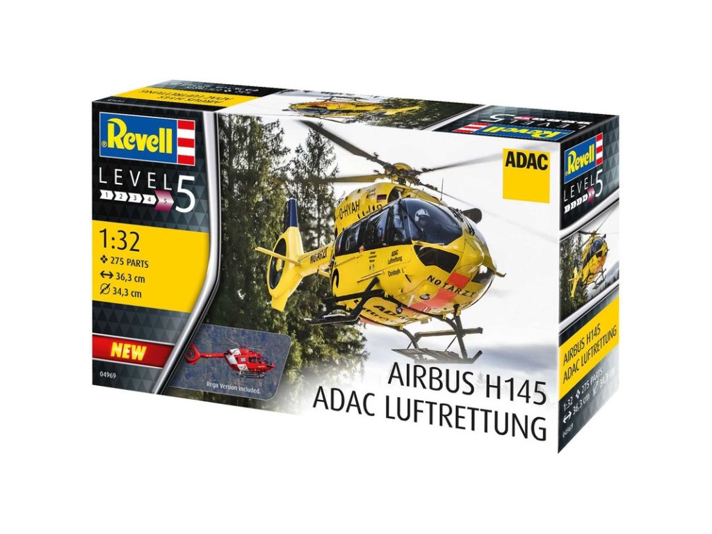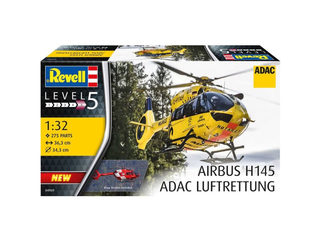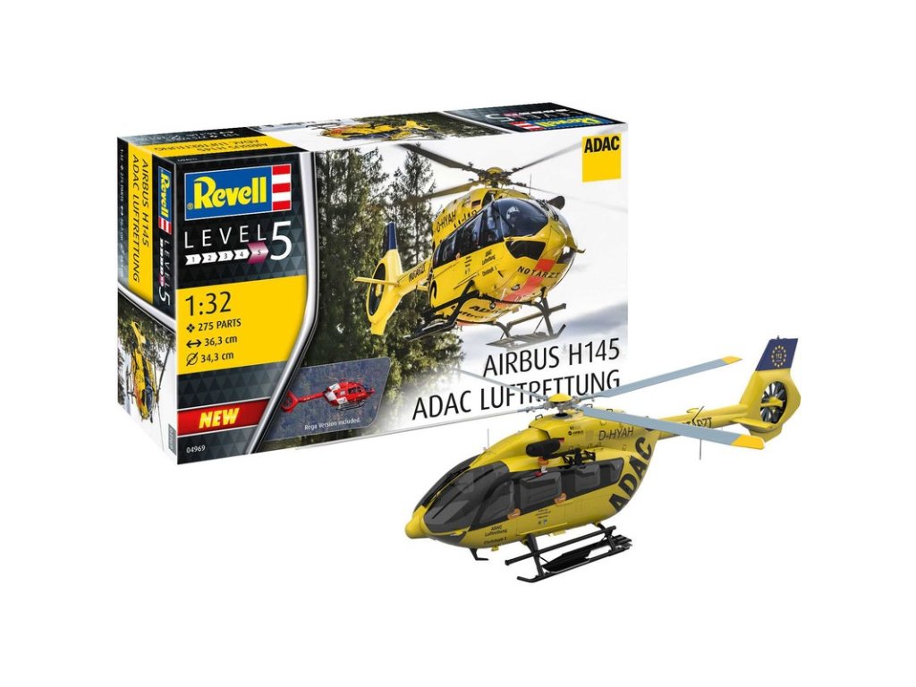 Plastikový model Revell 04969 – vrtulník H145 ADAC/REGA v měřítku 1:32 ke slepení. Stavebnice obsahuje 200 dílků, průměr rotoru 343 mm, obtížnost 5.