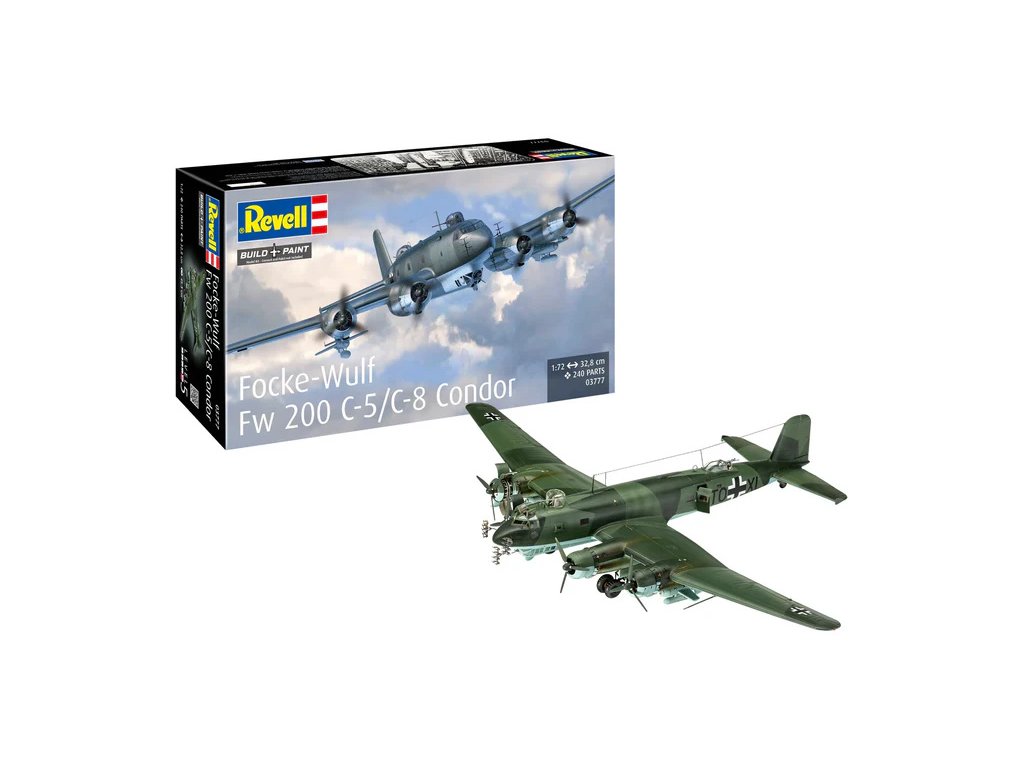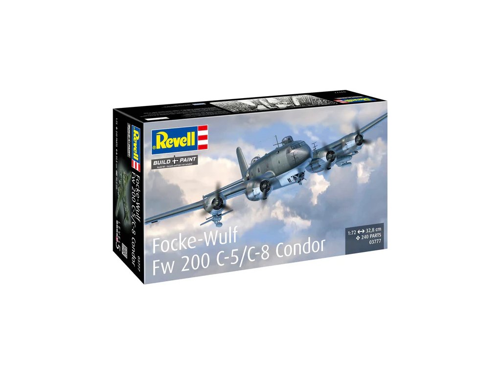 Plastikový model Revell 03777 - letadlo Focke-Wulf Fw 200 C-5/C-8 Condor v měřítku 1:72 ke slepení. Stavebnice obsahuje 240 dílků, rozpětí křídel 328 mm, obtížnost 5.