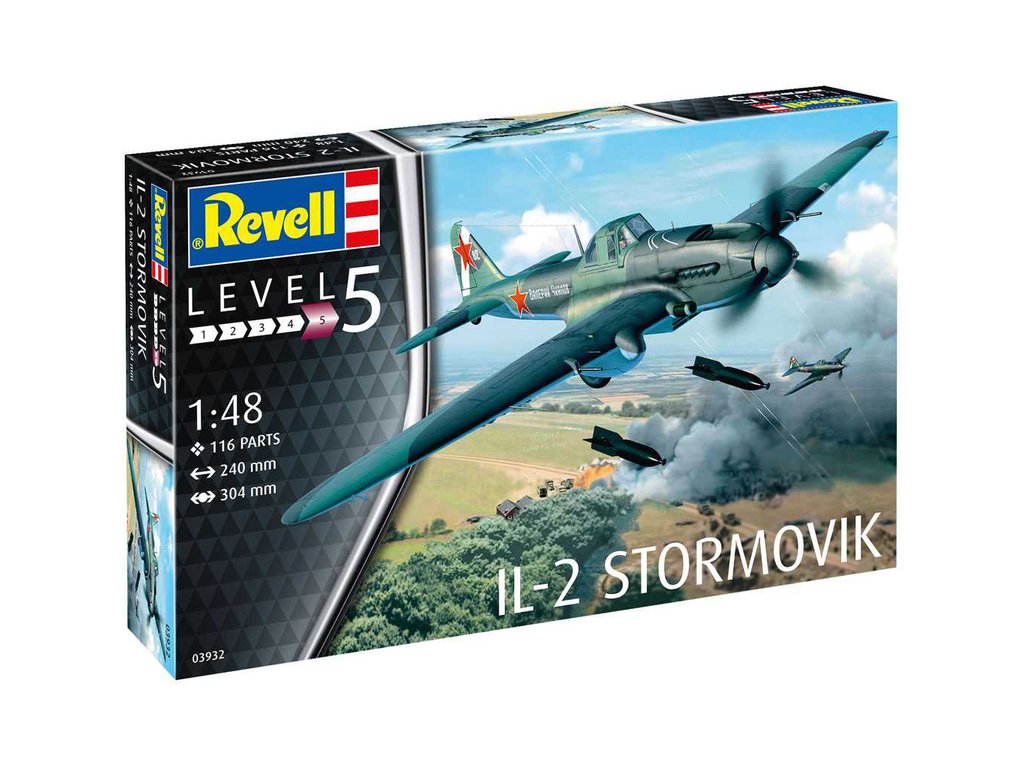 Plastikový model Revell 03932 – letadlo Iljušin IL-2 Stormovik v měřítku 1:48 ke slepení. Stavebnice obsahuje 116 dílků, rozpětí křídel 304 mm, délka 240 mm, obtížnost 5.