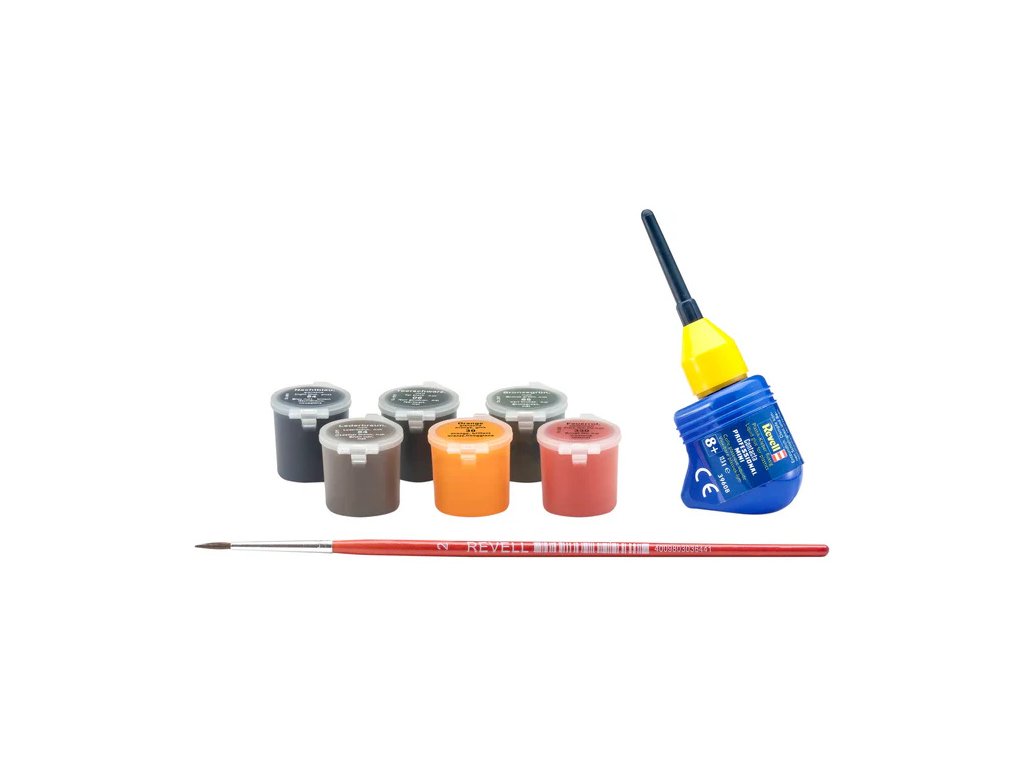 Plastikový model k sestavení, základní barvy, štětce, lepidlo, návod, obrisky, kniha v pevné vazbě (německy/anglicky)