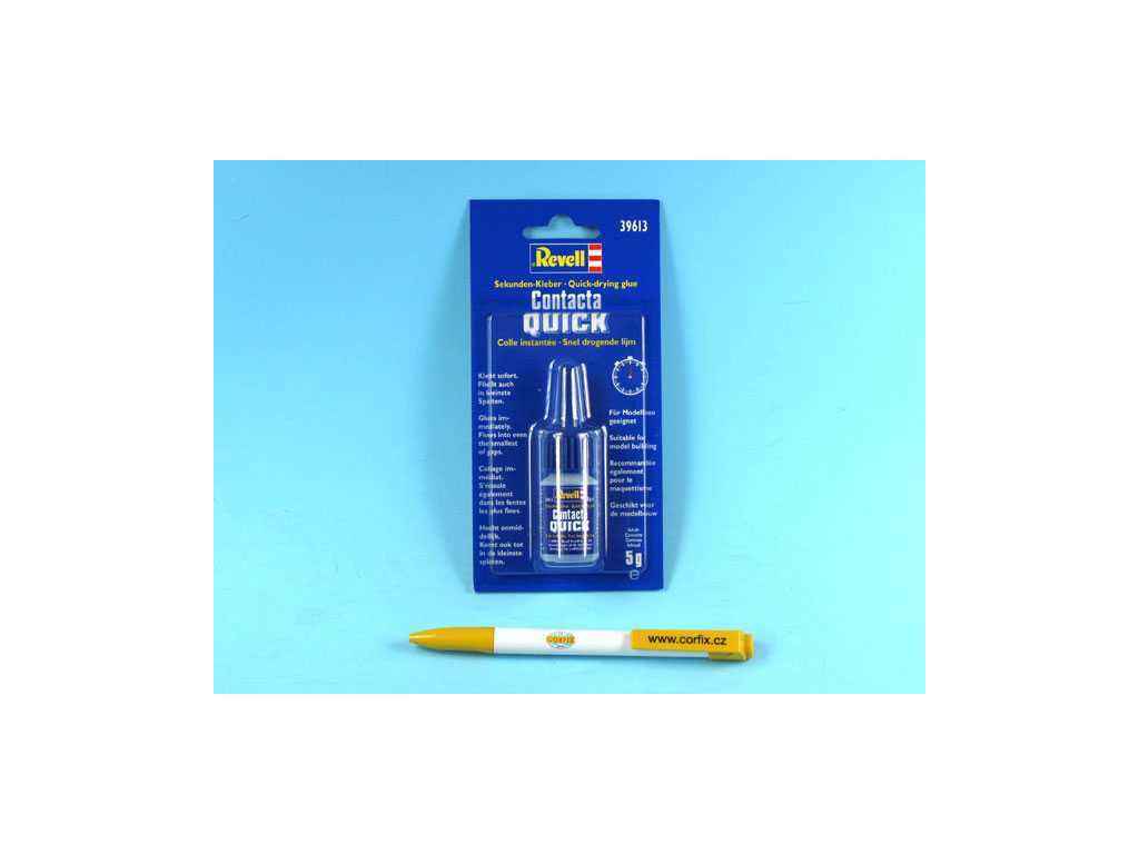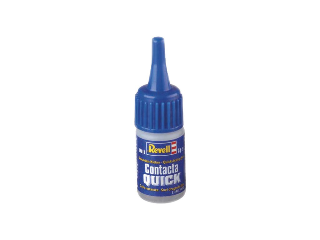 Revell Contacta Quick 39613 je sekundové lepidlo pro lepení zejména drobných částí. Speciálně navržené pro plastikové modely, lepí ale i dřevo a kovy. Nevhodné pro leštěné, voskované či naolejované povrchy a dále na polypropylen, polyetylen, teflon a polystyren.