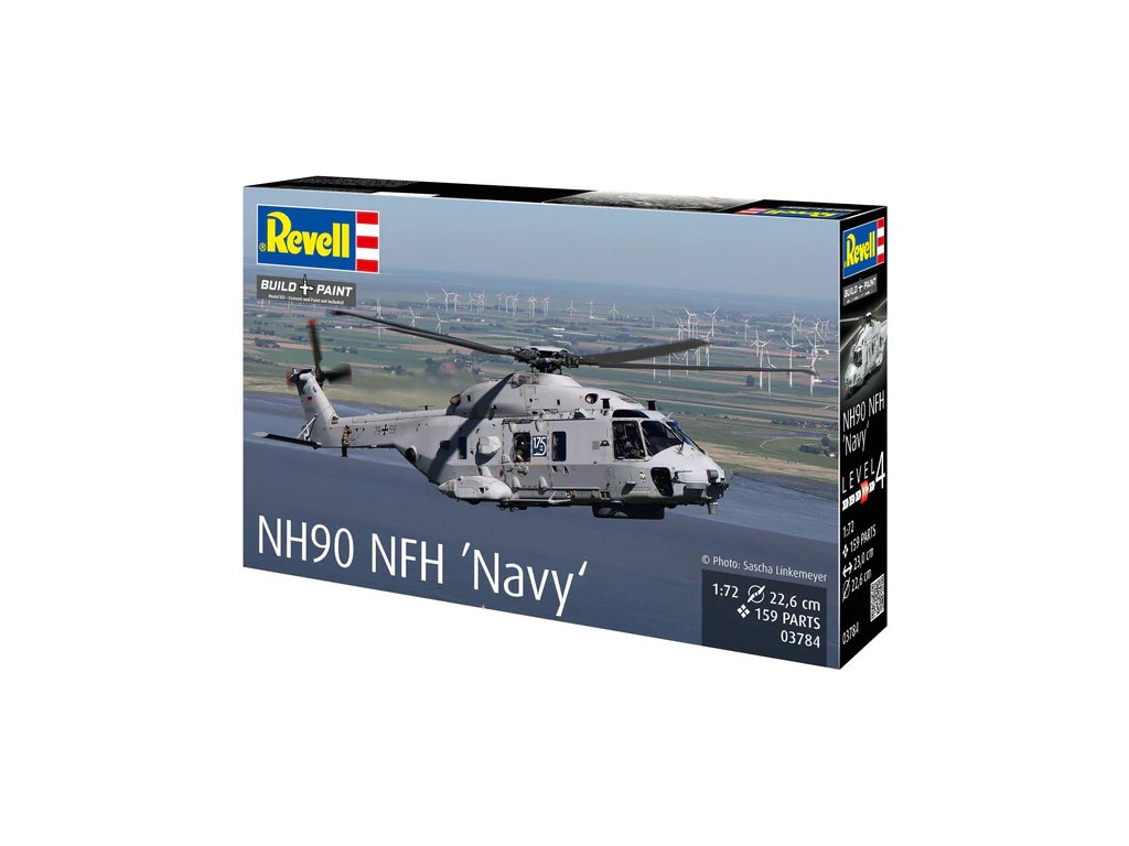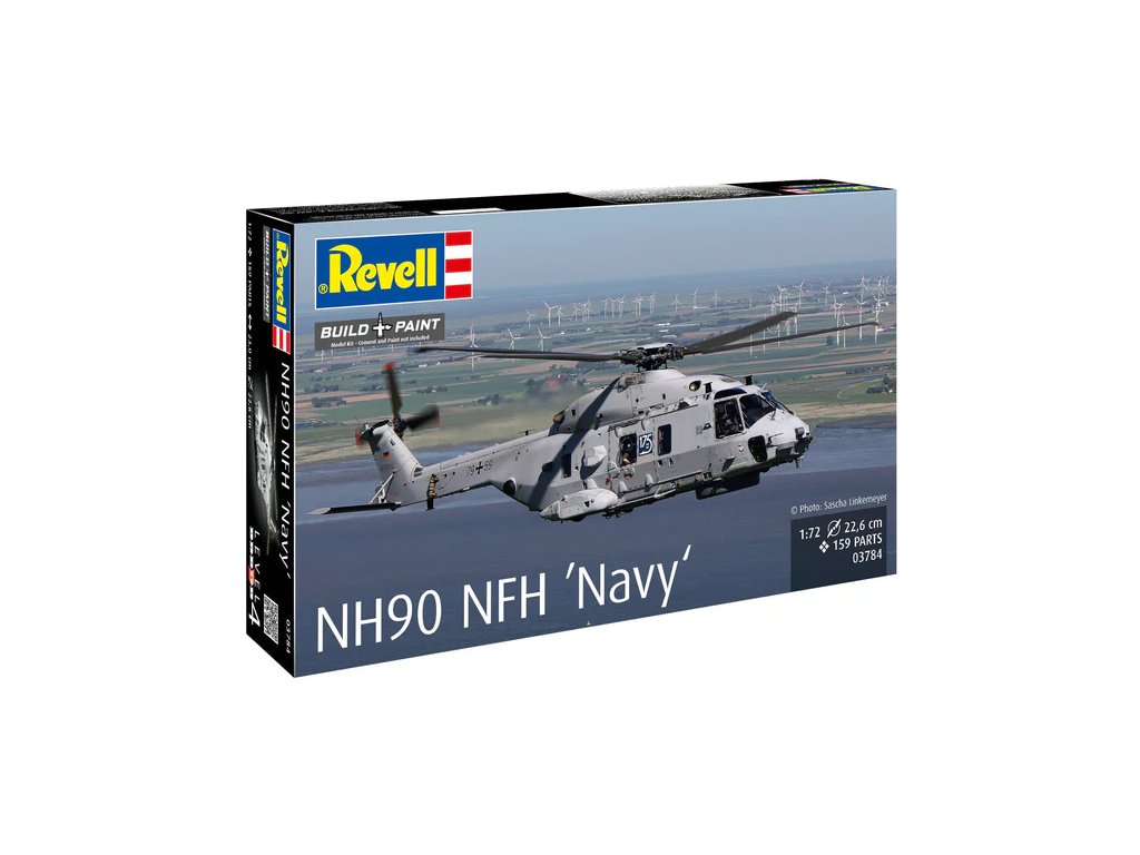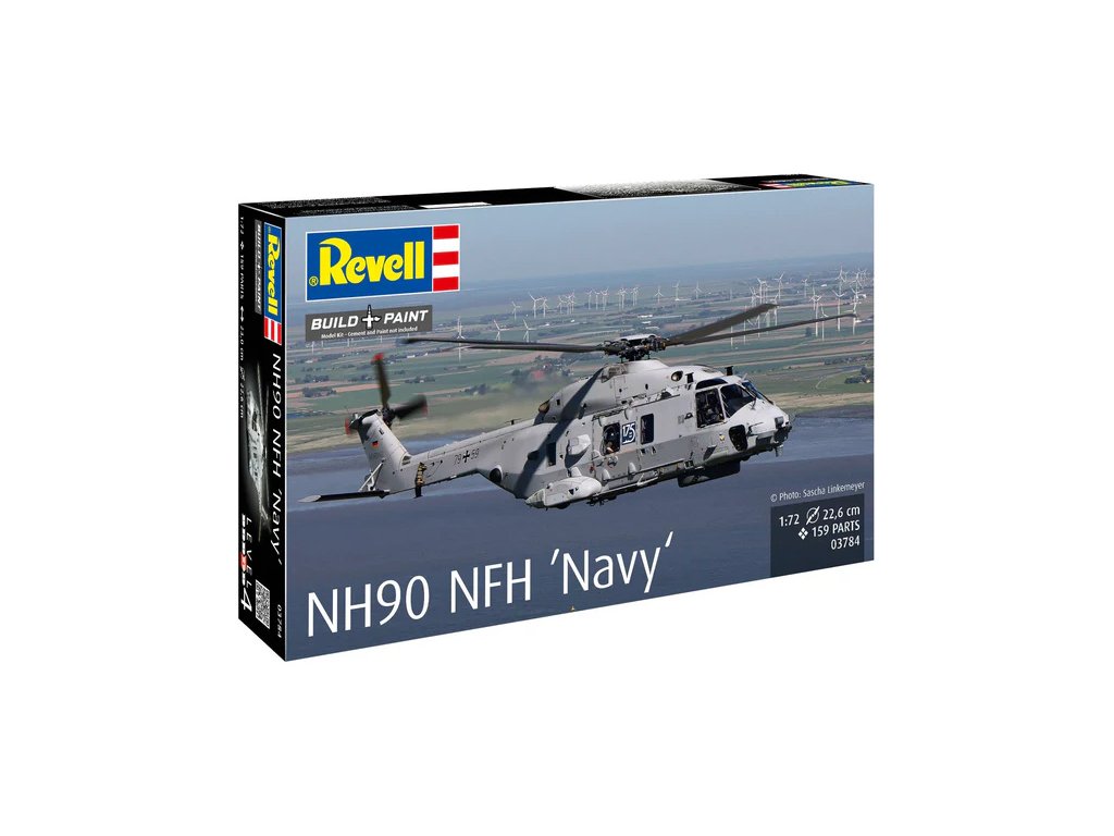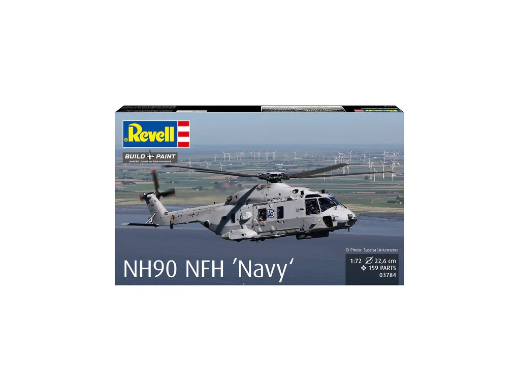 Plastikový model Revell 03784 - vrtulník NH90 NFH "Navy" v měřítku 1:72 ke slepení. Stavebnice obsahuje 159 dílků, rozpětí rotoru 226 mm, obtížnost 4.
