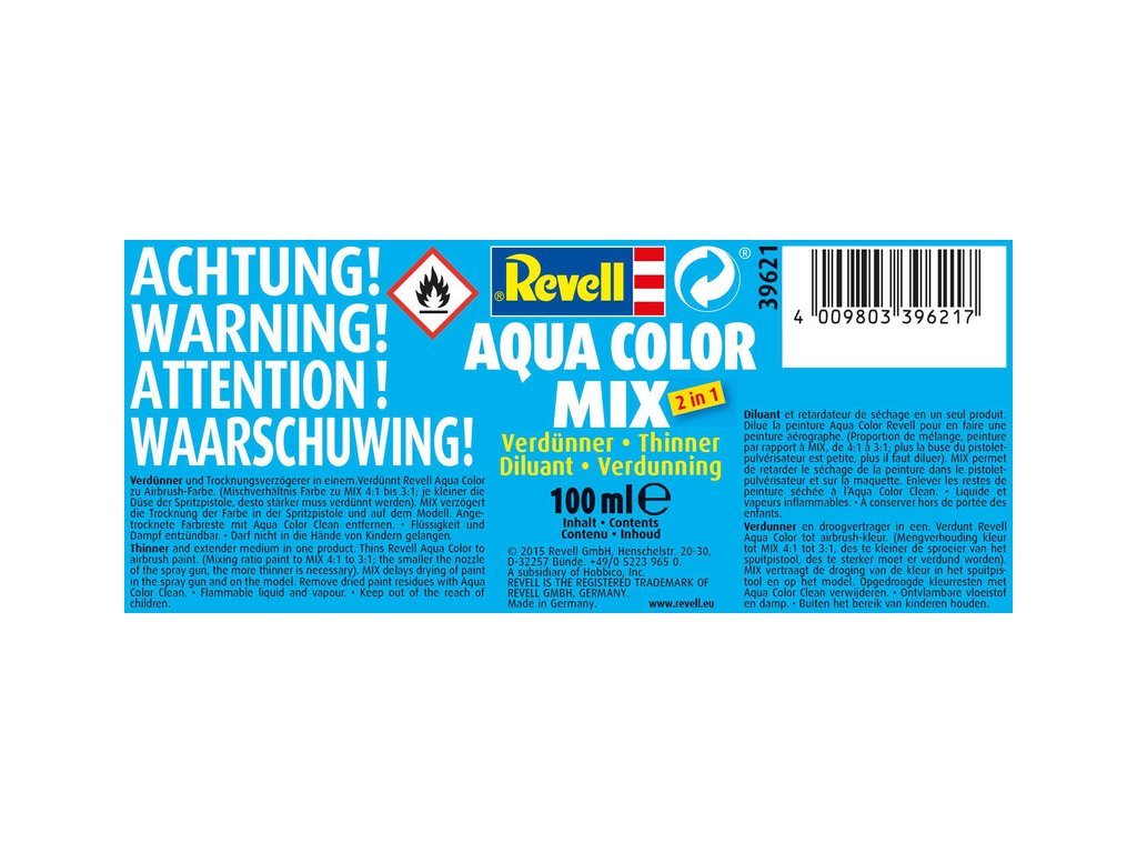 Revell Aqua Color Mix 39621 je ředidlo a zpomalovač schnutí pro akrylové barvy Revell. Slouží pro naředění barvy do stříkacích pistolí, případně pro nanášení štětcem. Výhodou oproti destilované vodě je to, že se výrazně neprodlužuje doba schnutí.