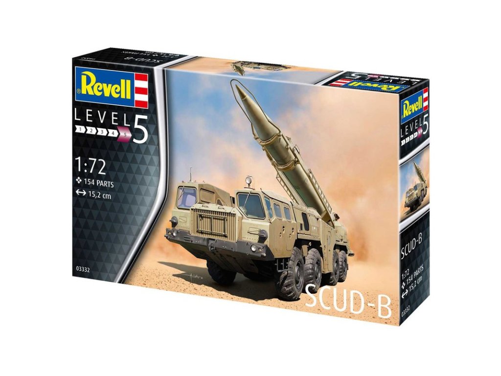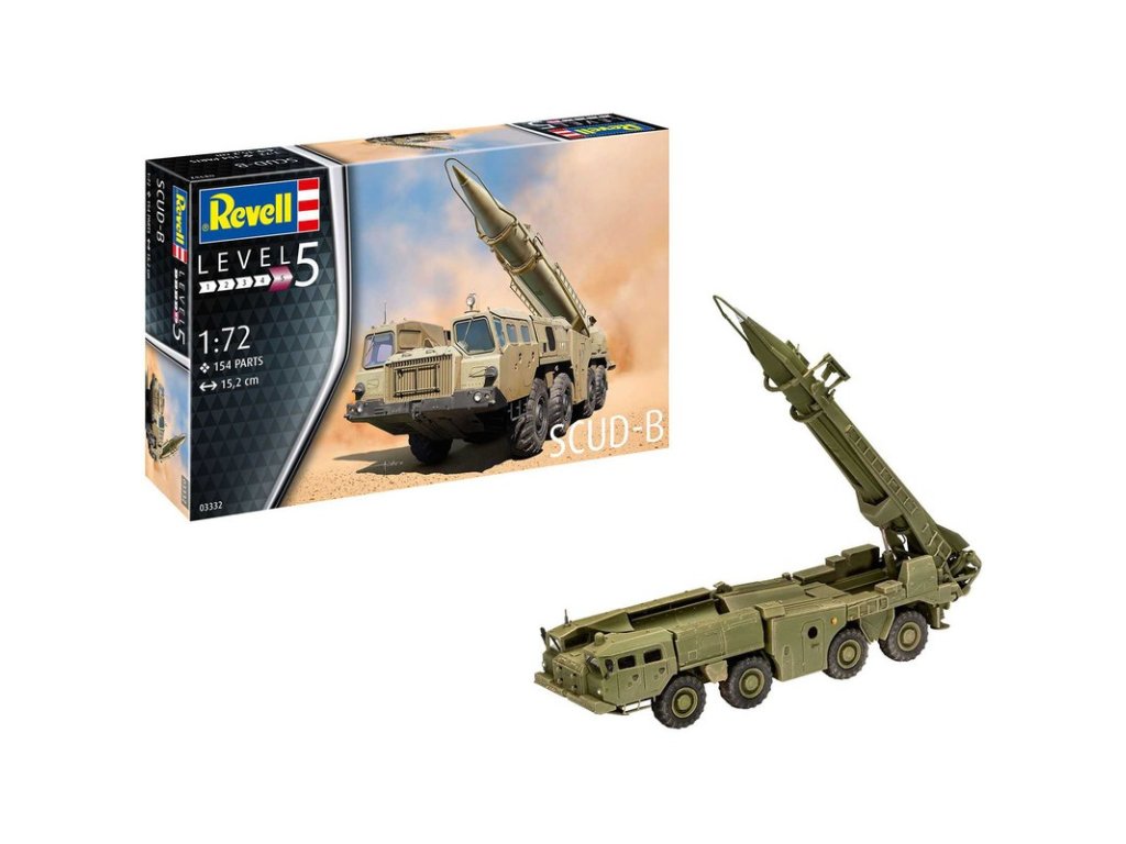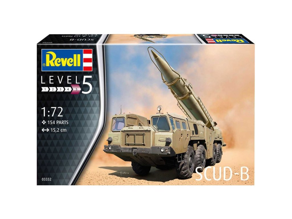 Plastikový model Revell 03332 – military Scud-B v měřítku 1:72 ke slepení. Stavebnice obsahuje 157 dílků, délka modelu je 152 mm, obtížnost 5.