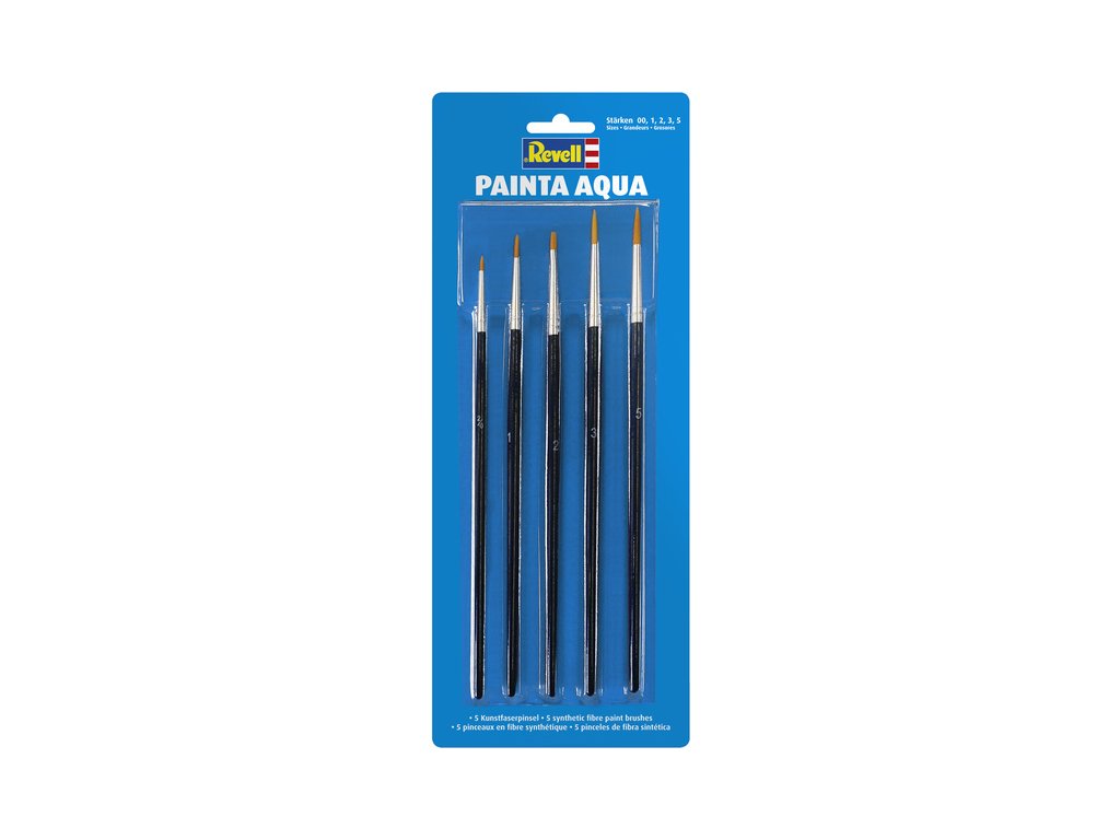 Revell sada štětců 39624 pro akrylové barvy. Štětce mají syntetický vlas,který umožňuje rovnoměrné nanášení akrylových či jiných vodou ředitelných barev. Balení obsahuje celkem 5 štětců o velikostech 00, 1, 2, 3, 5: