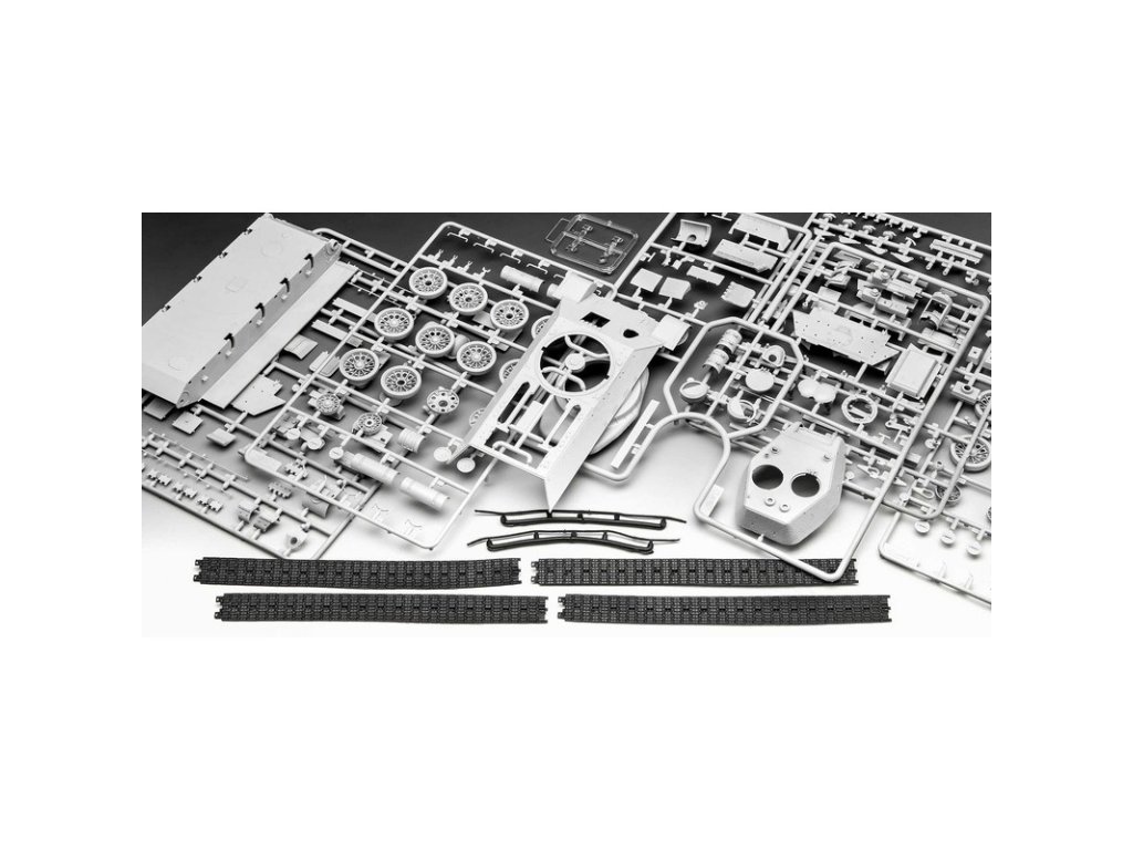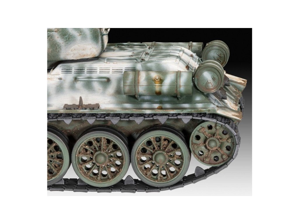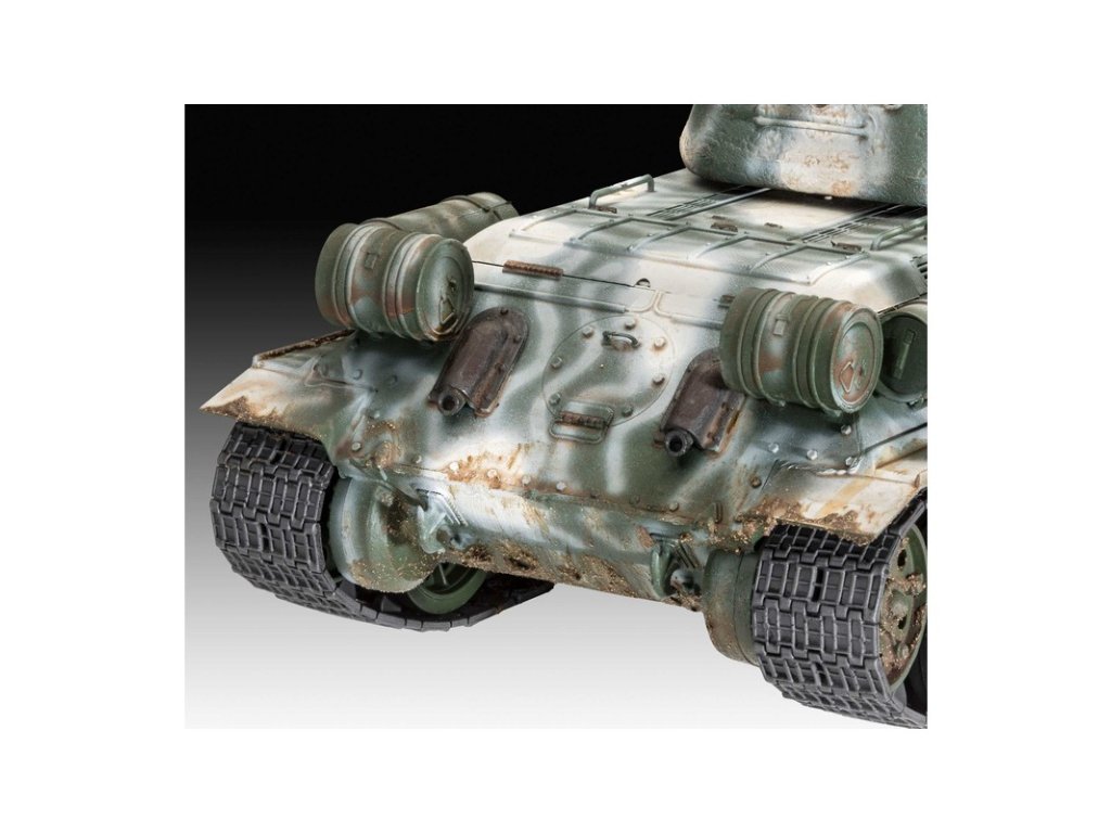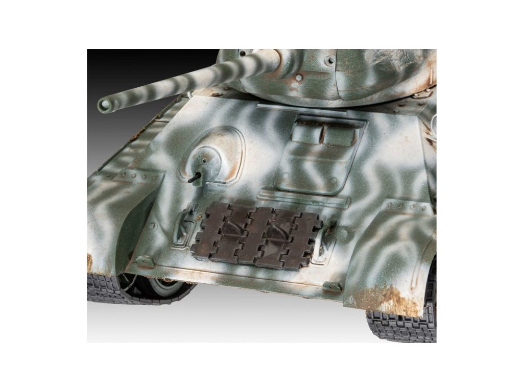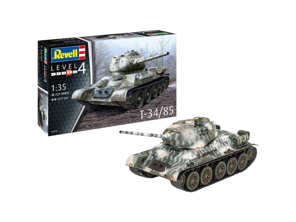 Plastikový model Revell 03319 – tank T34-85 v měřítku 1:35 ke slepení. Stavebnice obsahuje 229 dílků, délka modelu je 229 mm, obtížnost 4.