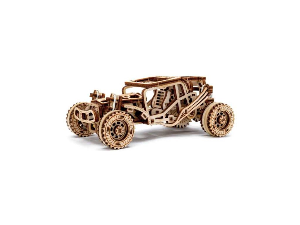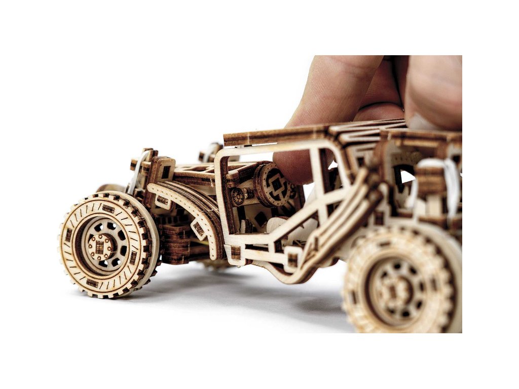 Tiny Adventures Buggy je víc než jen model - je to váš vstup do světa pohyblivých dřevěných mechanik. Ať už jste zkušený modelář nebo řešíte projekt jako je tento poprvé, jeho stavba je naplňující zkušeností. Přesné komponenty lze sestavit bez lepidla a brusný papír zajišťuje dokonalé přizpůsobení. Gumový motor dodá vaší bugině potřebnou hybnost a promění ji v malý pohyblivý zázrak.