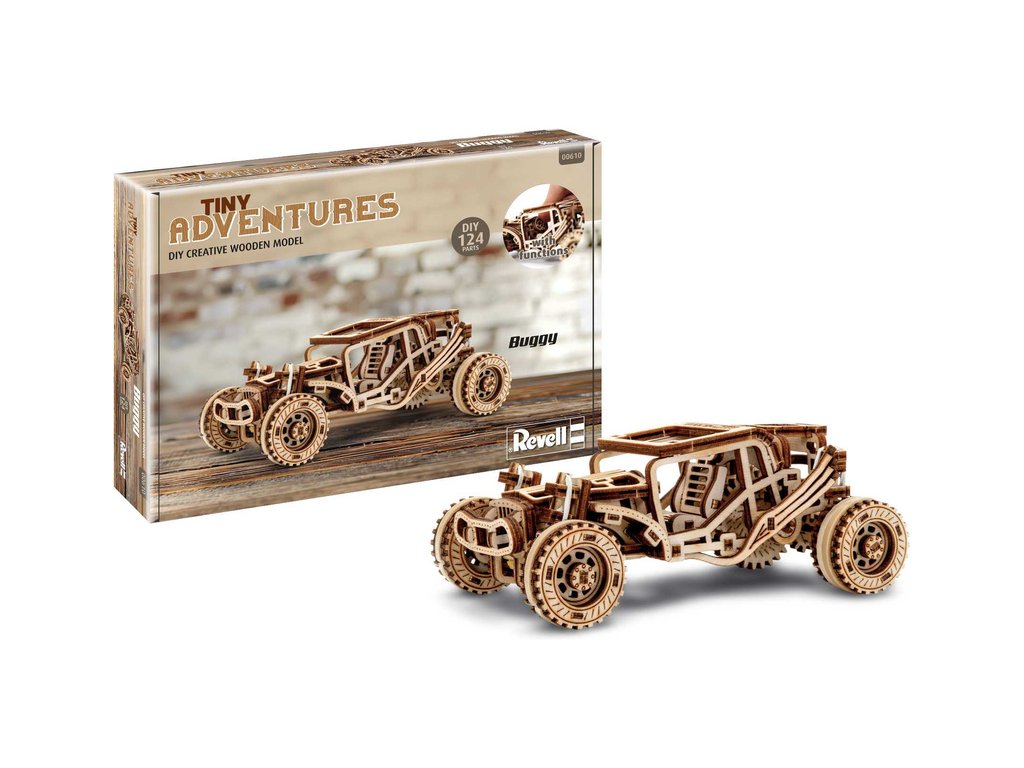 Dřevěný model Revell 00610 - Tiny Adventures - Buggy k sestavení. Stavebnice obsahuje 124 dílků, délka 15,4 cm.