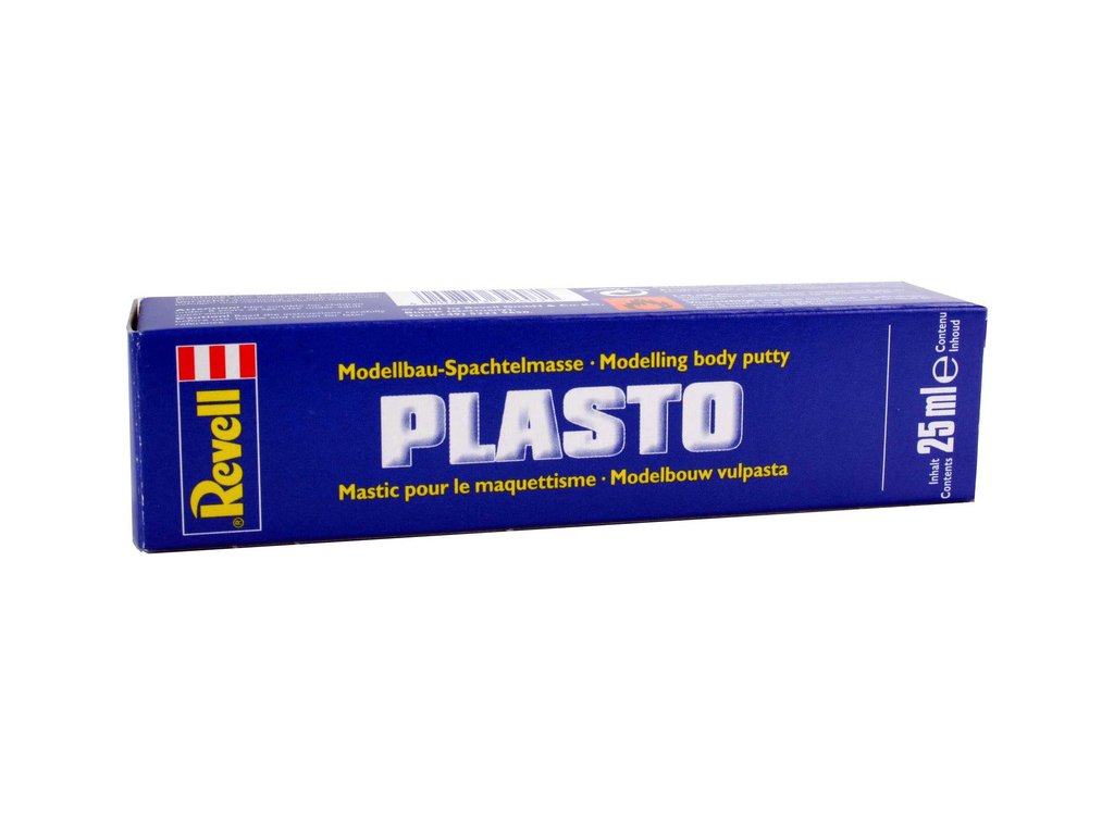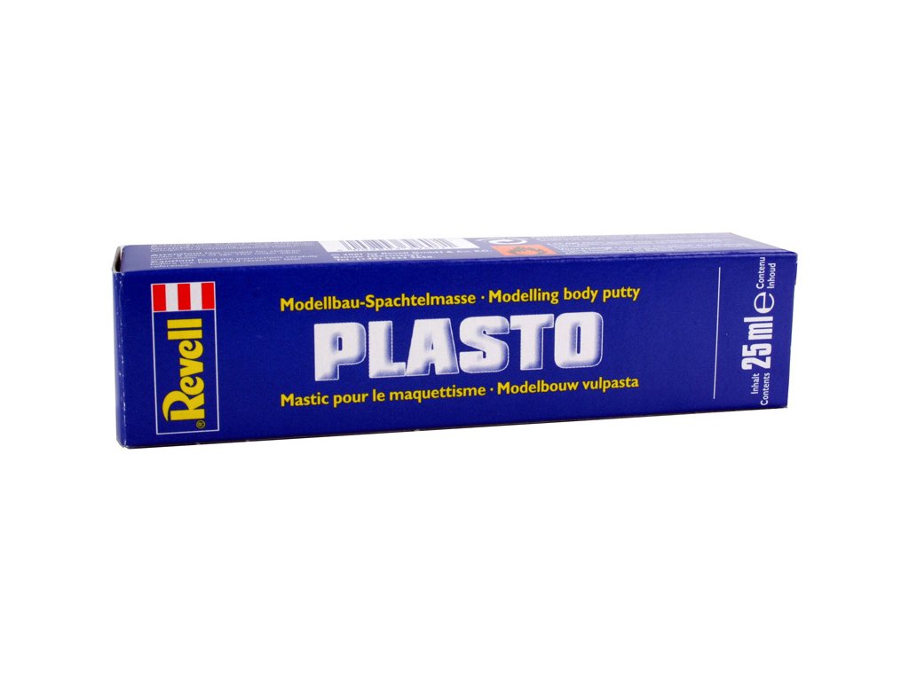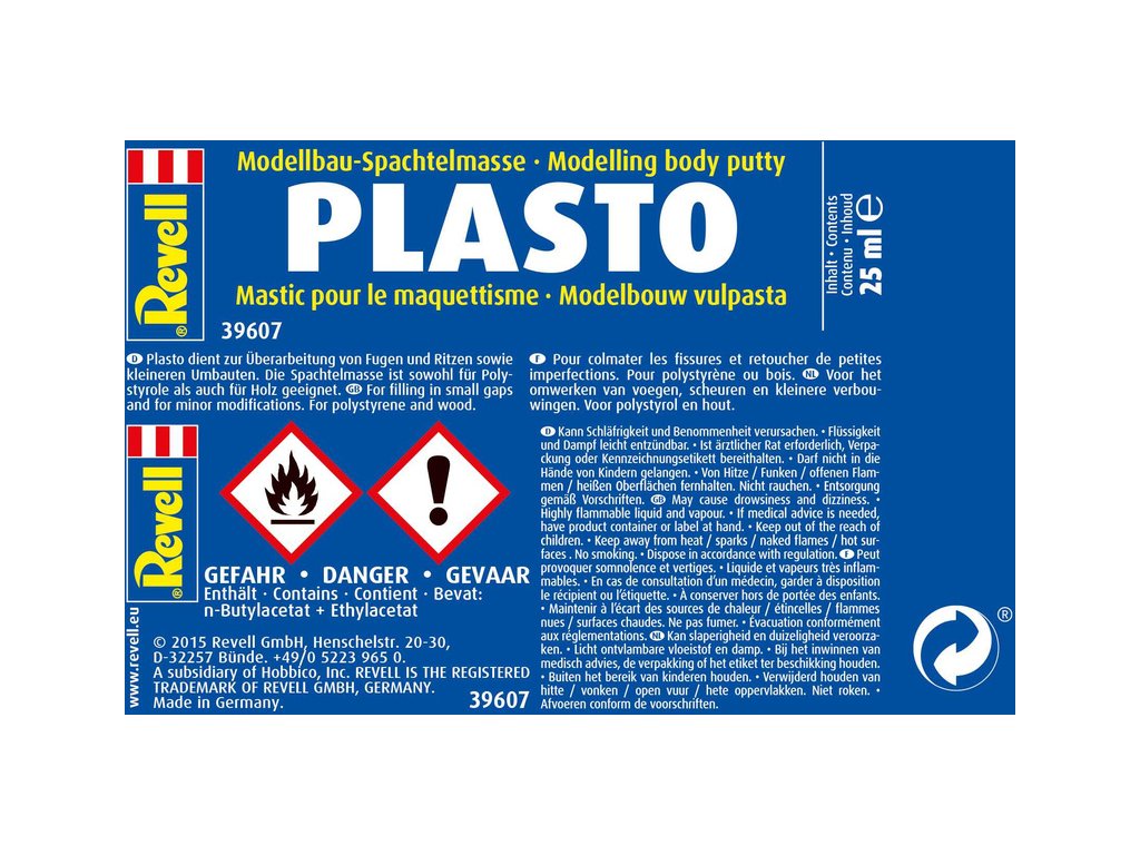 Revell Plasto 39607 je výplňový tmel pro opravy povrchu či vyplňování štěrbin v plastech. Stačí nabrat potřebné množství tmelu na špachtličku a jednoduše zatmelit povrch. Proti dotyku tmel schne asi 1 hodinu, k úplnému vytvrzení dojde typicky za 12 - 48 hodin (doba velmi závisí na tloušťce vrstvy a teplotě). Po vytvrzení lze povrch brousit smirkovým papírem či pilníkem.