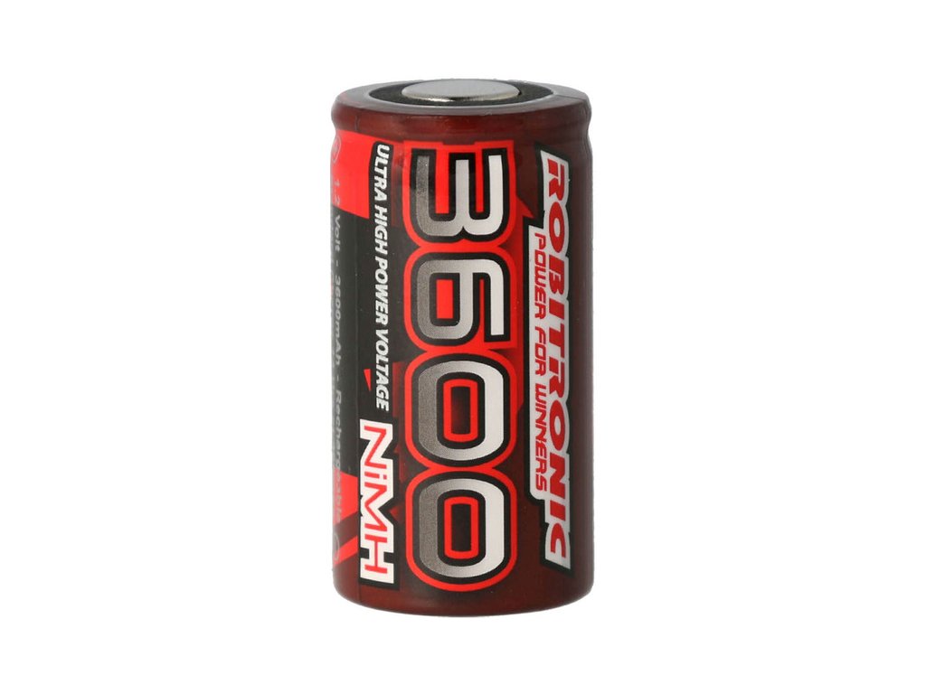Samostatný nabíjecí článek Robitronic NiMH 1.2 V s kapacitou 3600 mAh. Typ článku - Sub-C.