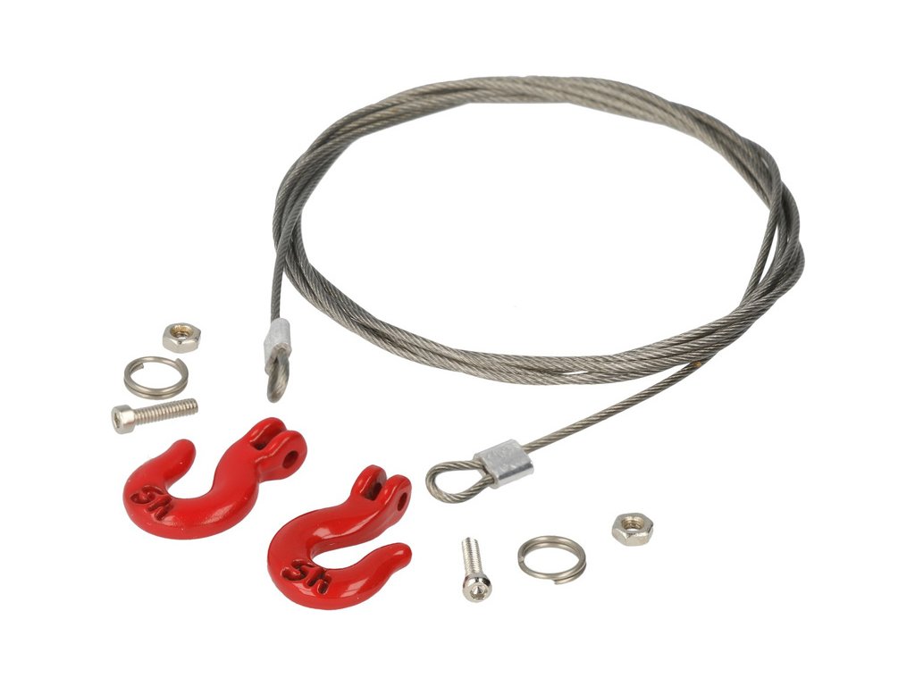 Udělejte si svůj RC model auta realističtější. Robitronic Vám nabízí ocelové lanko s oky a háky. Ocelové lanko s oky má průměr 1 mm a délku 1140 mm. Háky jsou v červeném provedení o rozměrech 21 x 13 x 3,5 mm. Balené obsahuje ocelové lanko s oky, 2 x háky, montážní příslušenství.