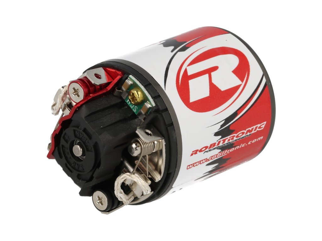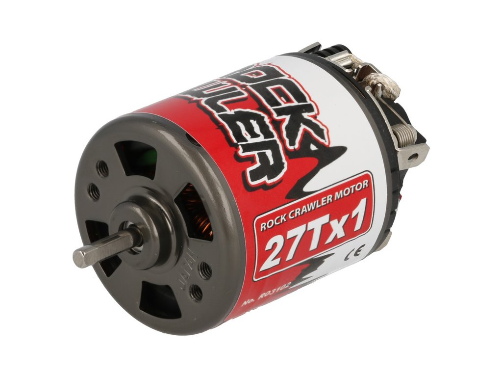Precizní japonský stejnosměrný motor Robitronic Rock Crawler řady 540 s 27 závity pro nejnáročnější aplikace. Motor má kuličkové ložiska, velmi tichý chod s minimem vibrací a díky velmi malé mezeře mezi statorem a rotorem velký kroutící moment. Kartáče jsou ze směsi stříbra a uhlíku.