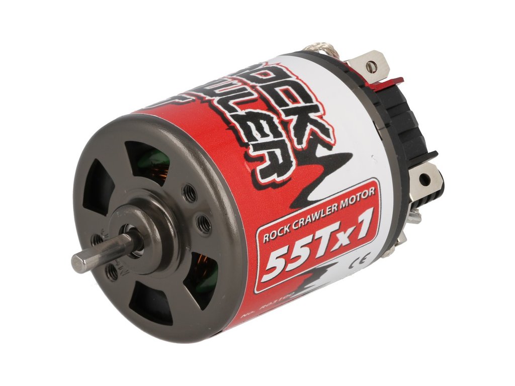Precizní japonský stejnosměrný motor Robitronic Rock Crawler řady 540 s 55 závity pro nejnáročnější aplikace. Motor má kuličkové ložiska, velmi tichý chod s minimem vibrací a díky velmi malé mezeře mezi statorem a rotorem velký kroutící moment. Kartáče jsou ze směsi stříbra a uhlíku.