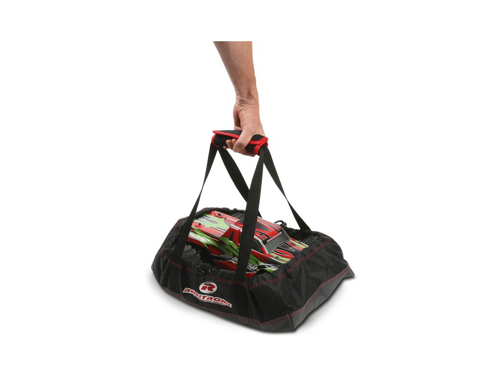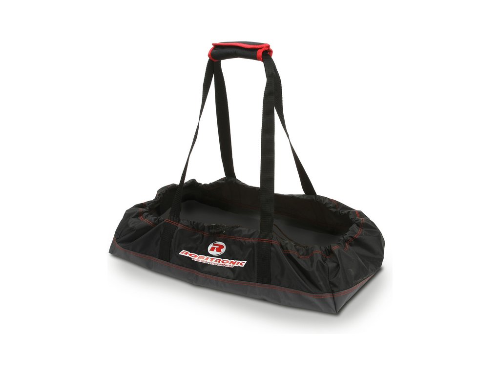 Robitronic taška pro auta Buggy 1:8 má rozměry 33 cm x 57 cm x 15 cm, na konci lemu je stahovací šňůra. Délka ucha je cca 30 cm. Pevná prošitá textilie s pevnými uchy. Uložte model po jízdě do tašky a udržte sedadla, či zavazadlový prostor čistý a suchý.