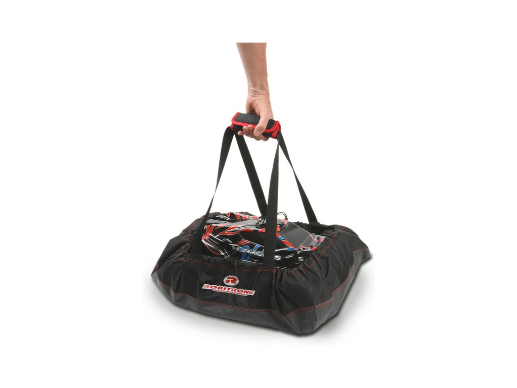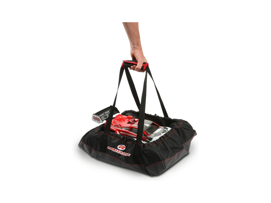 Robitronic taška pro auta Truggy 1:8 má rozměry 44 x 57 x 16 cm, na konci lemu je stahovací šňůra. Délka ucha je cca 30 cm. Pevná prošitá textilie s pevnými uchy. Uložte model po jízdě do tašky a udržte sedadla, či zavazadlový prostor čistý a suchý.