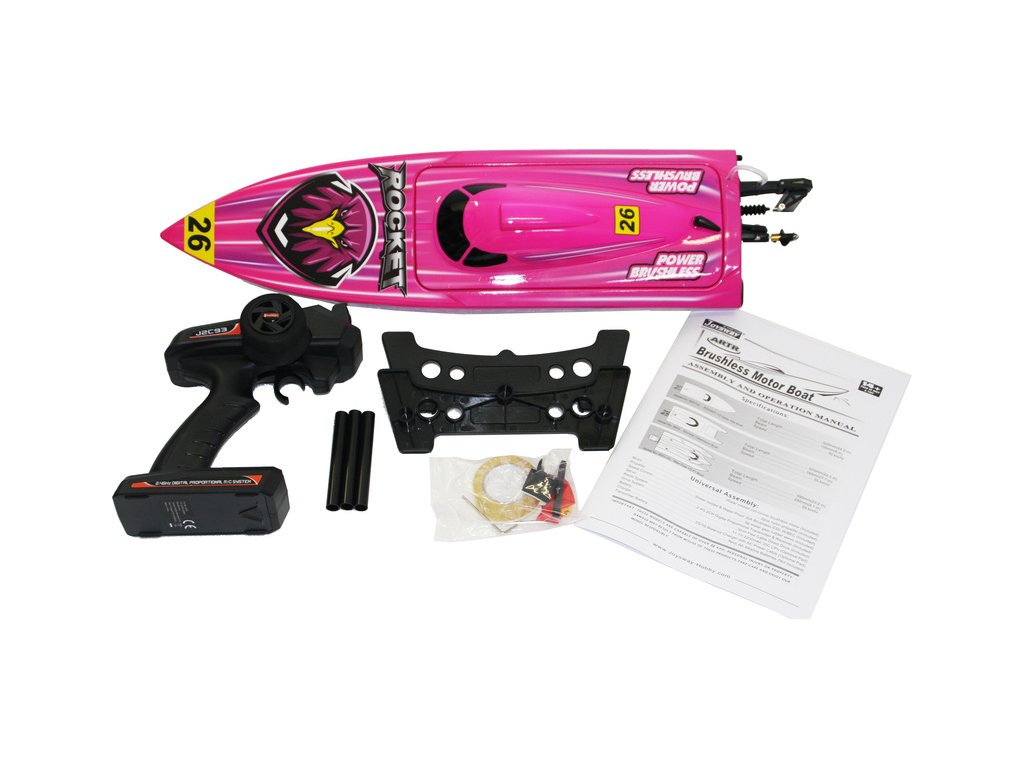 Hotový sestavený nabarvený RC model lodi Rocket Brushless V2 s nainstalovaným vodou chlazeným střídavým motorem, 30A vodou chlazeným střídavým regulátorem s konektorem XT60, voděodolným servem 9g MG a 4-kanálovým přijímačem J2C91R 2,4HGz, V balení je náhradní lodní šroub, lepící páska, balonek na přijímač, konektor XT60 pro baterii se smršťovací bužírkou, imbusy 2mm a 2,5mm, stahovací páska, suchý zip pro baterii, pásky mechové gumy, vysílač Joysway 2,4GHz FHSS, stojánek a manuál.