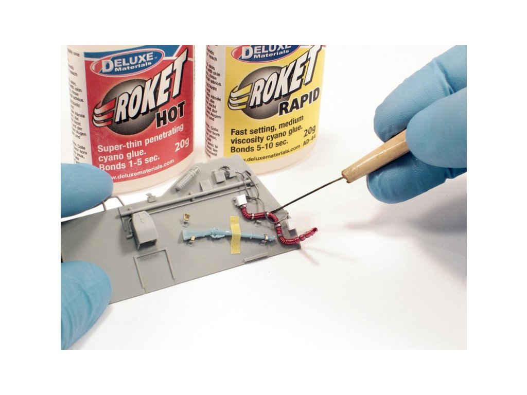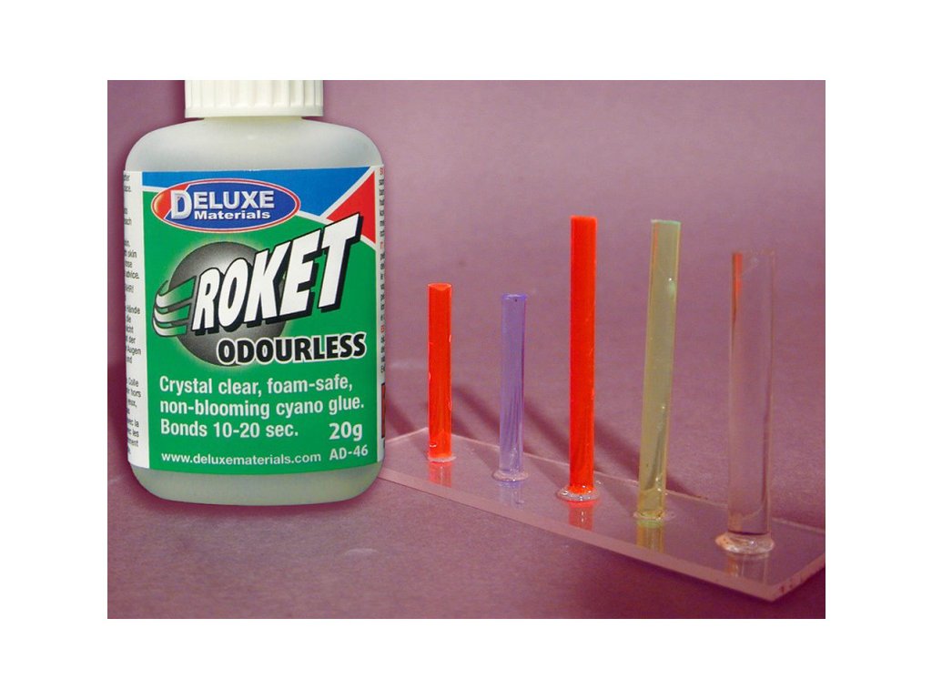 Roket Odourless je kyanokrylátové lepidlo střední konzistence, které lepí bez zápachu. Lepí o 2 až 3 sekundy později, než standardní kyanokrylátová lepidla. Roket Odourless nenapadá pěnové hmoty (polystyren, depron, polypropylen, atd.), proto se výborně lepení těchto hmot s kombinací se dřevem. Spoj je hotový za méně než patnáct sekund.