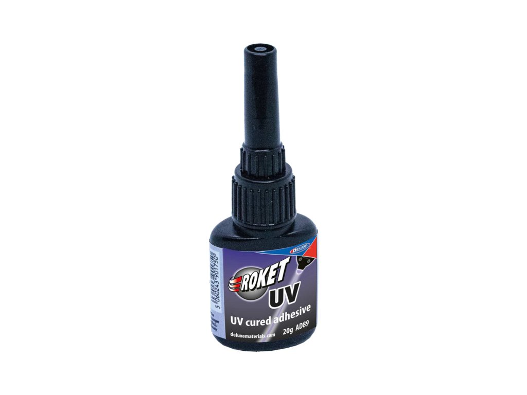 Lepidlo Roket UV od Deluxe Materials patří mezi lepidla, které se vytvrzují UV zářením. Roket UV vytváří zcela čirý spoj, lepí tvrdé plasty, kompozitní materiály, dřevo a kovy.