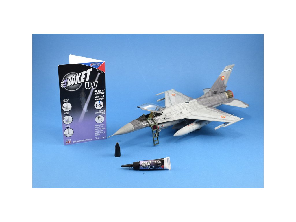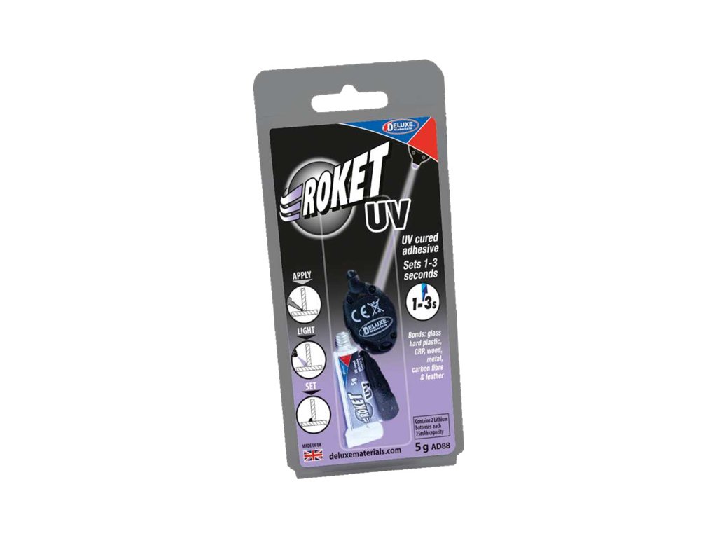 Lepidlo Roket UV od Deluxe Materials patří mezi lepidla, které se vytvrzují UV zářením. Roket UV vytváří zcela čirý spoj, lepí tvrdé plasty, kompozitní materiály, dřevo a kovy.