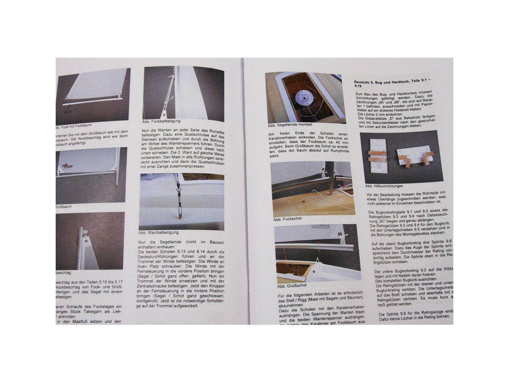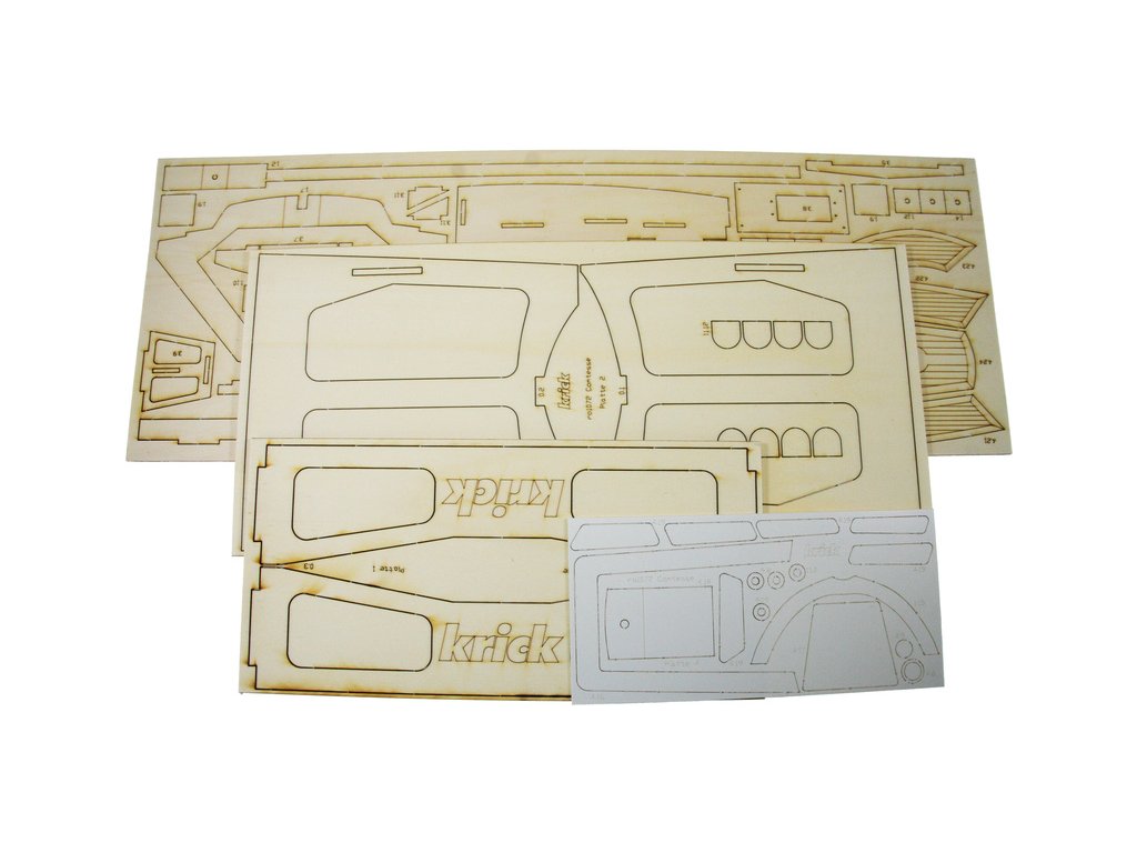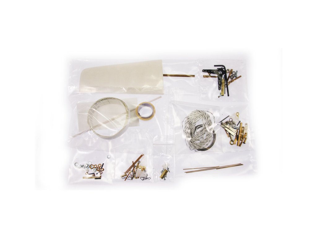 Po otevření víka krabice naleznete výlisek trupu a nástaveb, sadu překližkových dílů, sadu stožáru a ráhna, plachty, sáčky s montážním příslušenstvím, sadu výkresů a manuál.