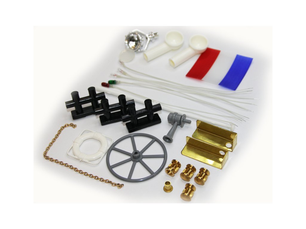 Příslušenství pro RC model lodi ROMARIN Dolly - sada maketových doplňků, jako kolo kormidla, záchranné kolo, světlomet, osvětlení LED, výlisek houkačky, vlajka, řetízek, drobné doplňky.