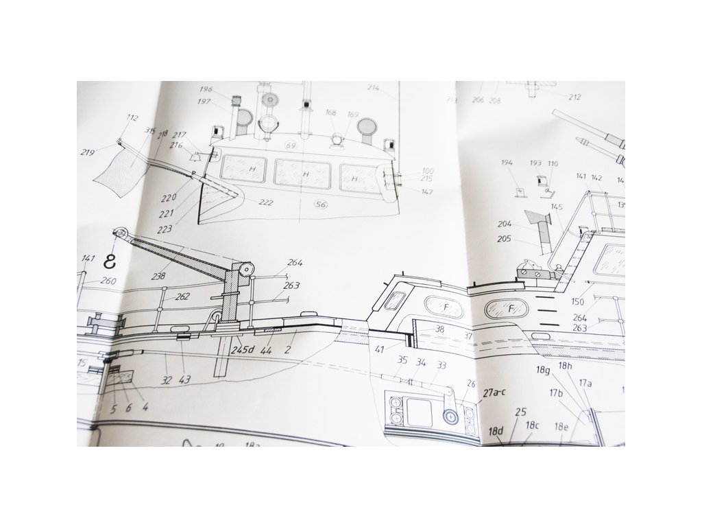 Set obsahuje kompletní sadu výkresové dokumentace modelu v měřítku 1:1 s obrázky jednotlivých detailů. Na výkrese jsou v měřítku nakresleny montážní sestavy, jejich kompletace a to včetně stěžňů a ráhen a způsob vázání lanoví. Vícejazyčný postup stavby rámcově upravuje logické sestavení jednotlivých komponentů.