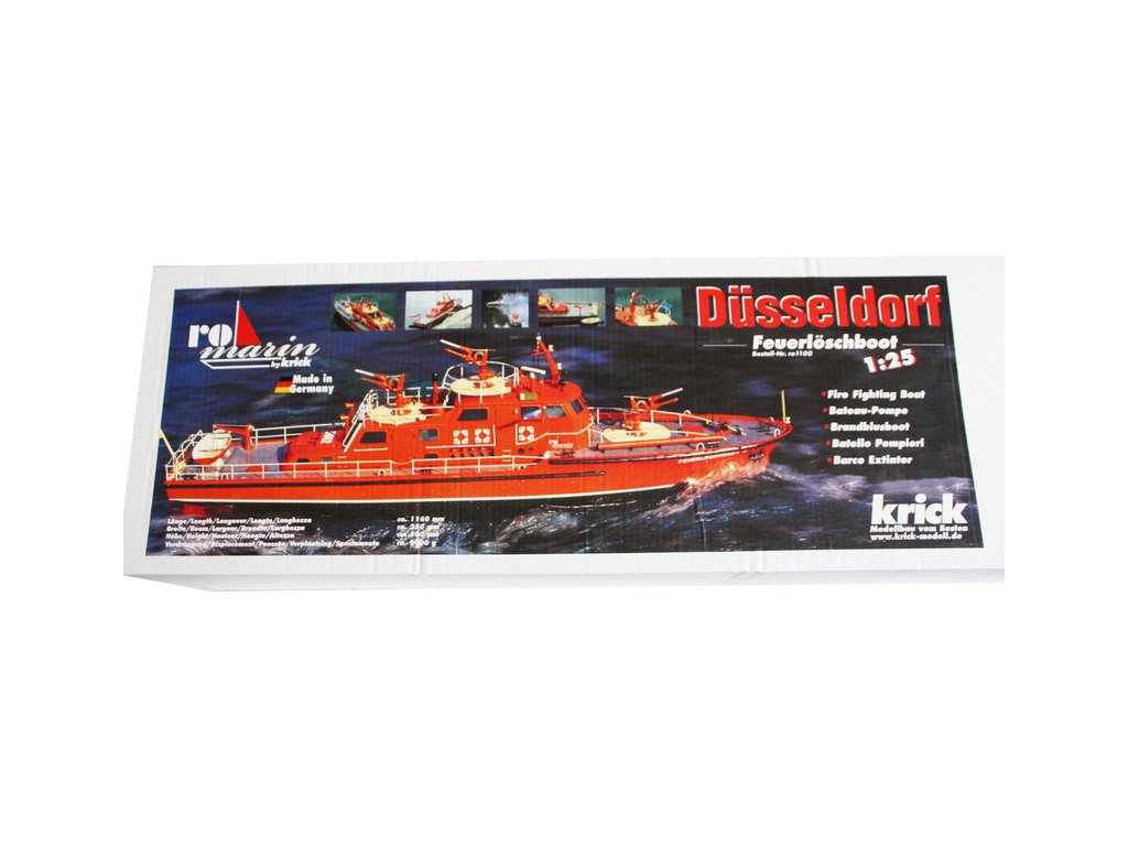 Maketa hasičského člunu Düsseldorf v měřítku 1:25 od firmy ROMARIN pro začínající i pokročilé lodní modeláře. Trup a paluba jsou z teplem tvářeného plastu ABS, CNC obráběné dřevěné a ABS díly pro pohon a instalaci RC. Kompletní kormidlo, 2x trubka náhonu a hřídele, lodní šrouby a spojky. Podrobný stavební návod v češtině, plány.