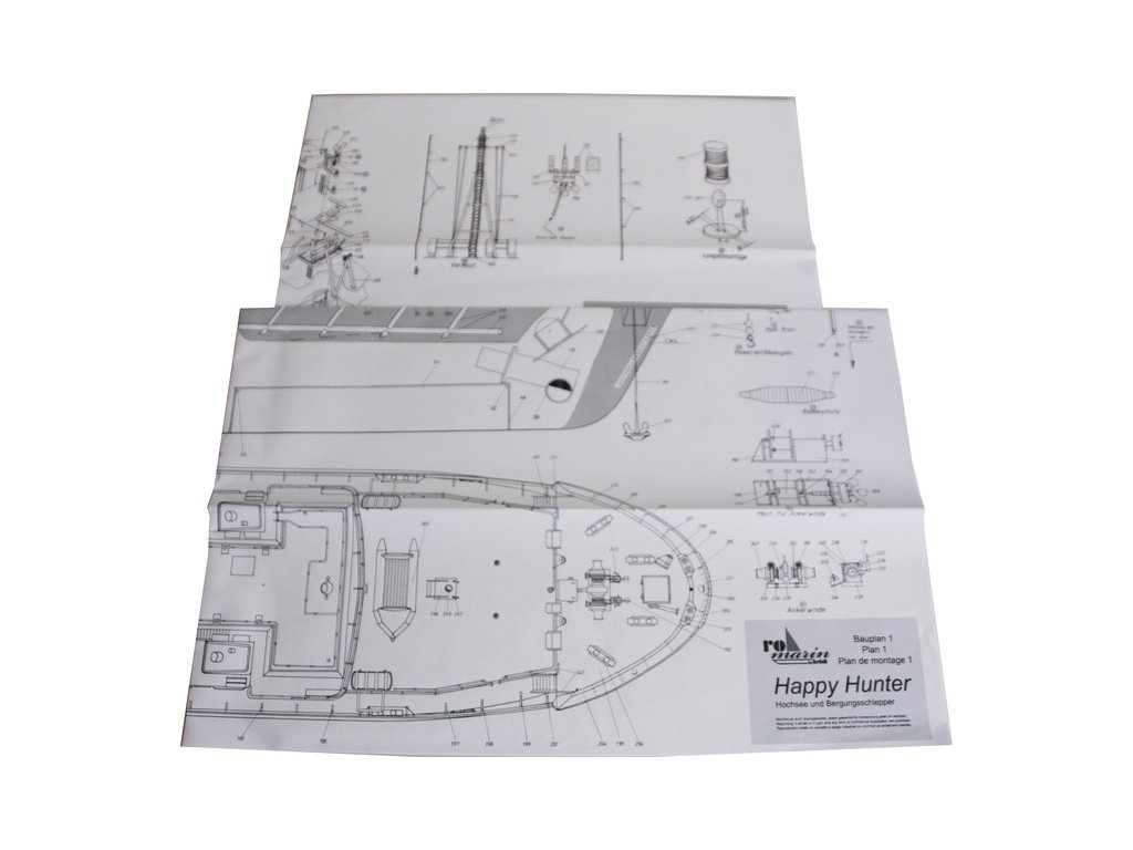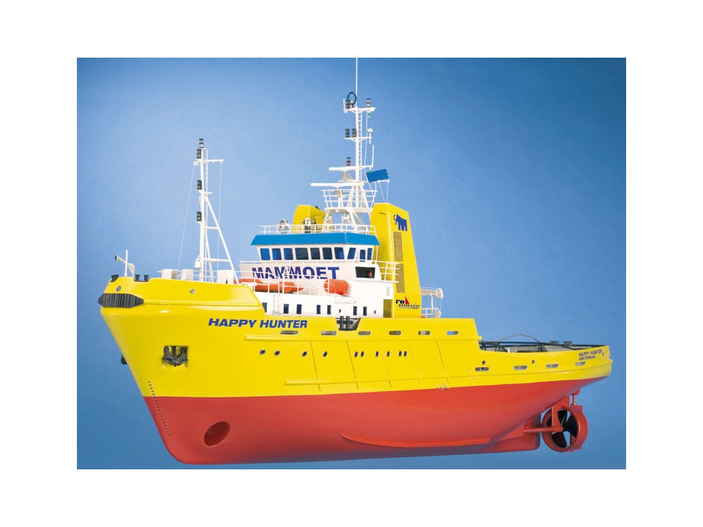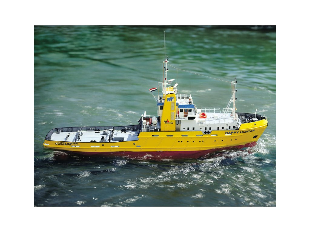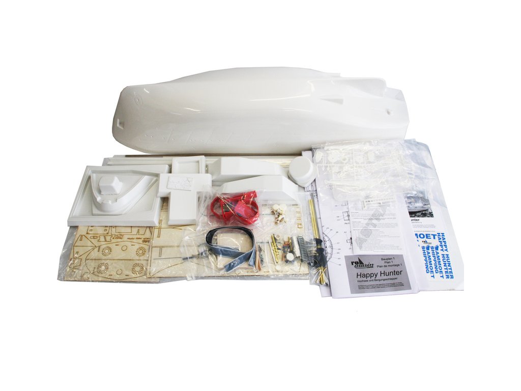 ROMARIN Happy Hunter kit je stavebnice repliky holandského zaoceánského záchranného remorkéru 1:50. Obsahuje plastové díly trupu, paluby a interiéru, dřevěné součásti, výkres, lodní šrouby a příslušenství. Samolepící obtisky, vícedílný stavební návod a plán.
