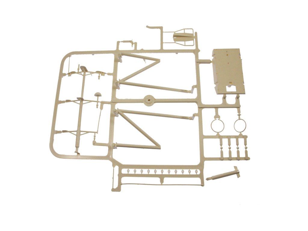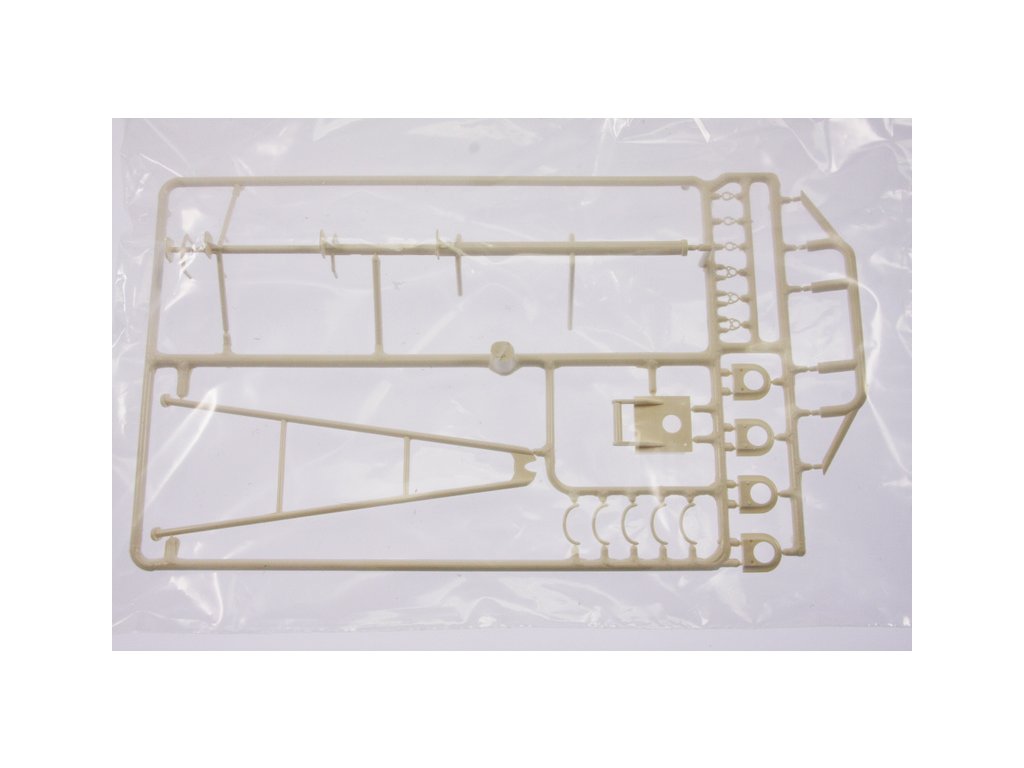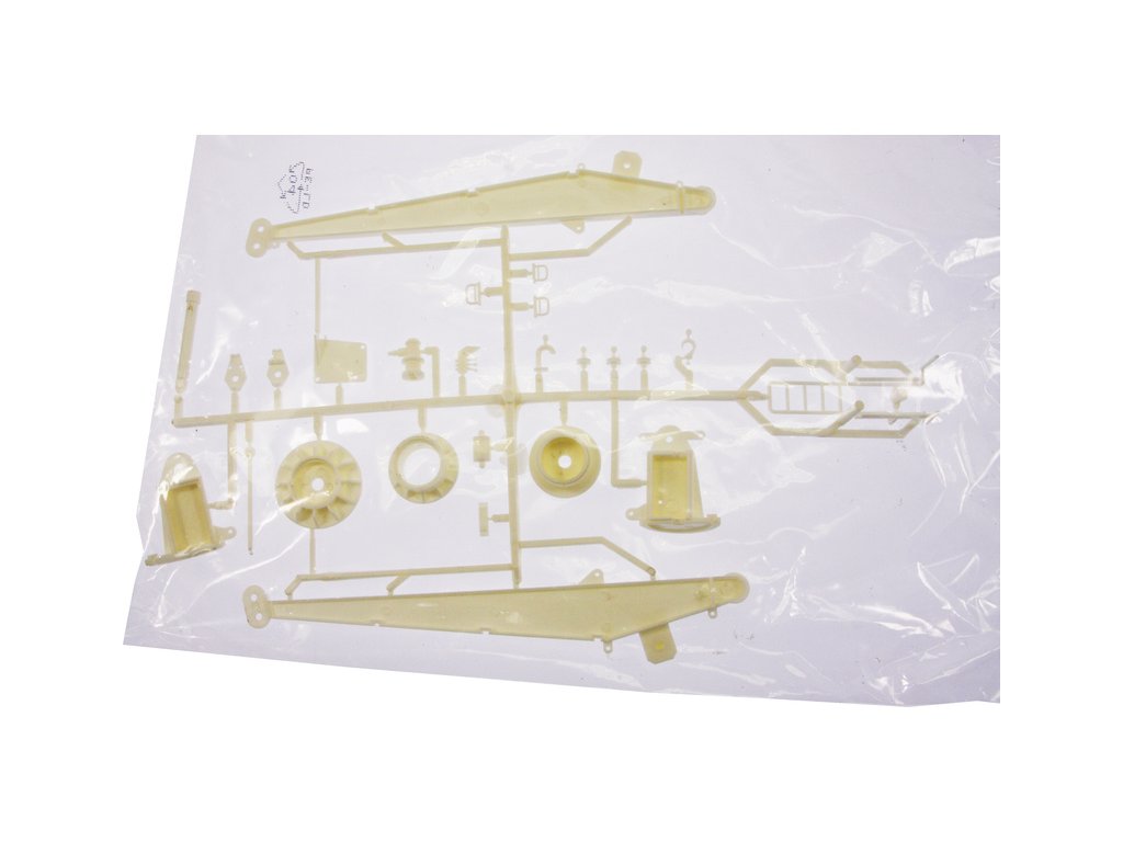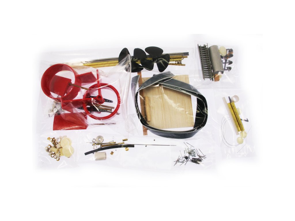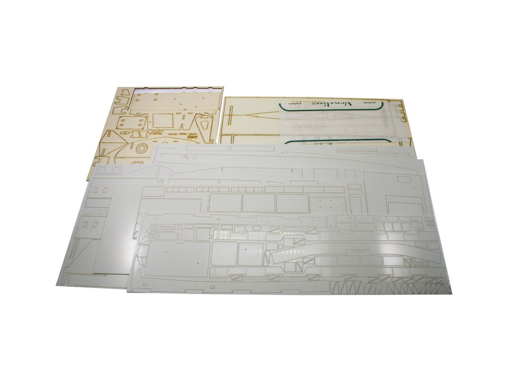 Po otevření víka krabice naleznete dřevěné, plastové a kovové díly modelu, sadu lišt, drobné součásti uzavřené v sáčcích, sadu výkresů a manuál.