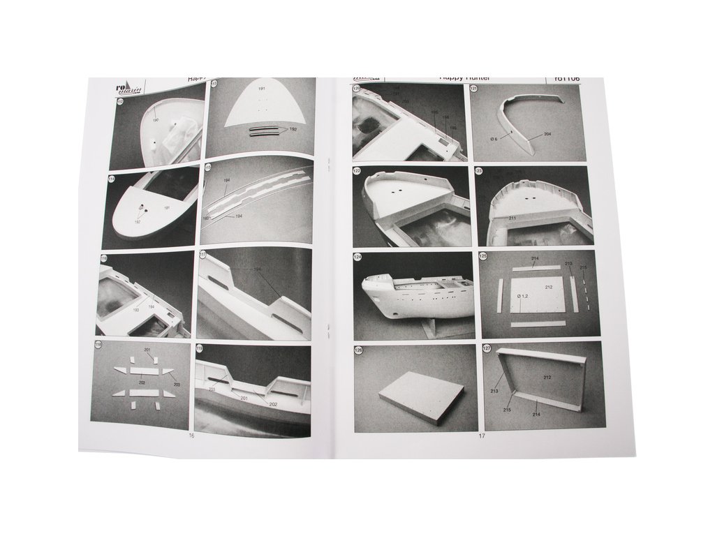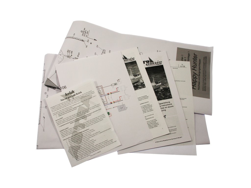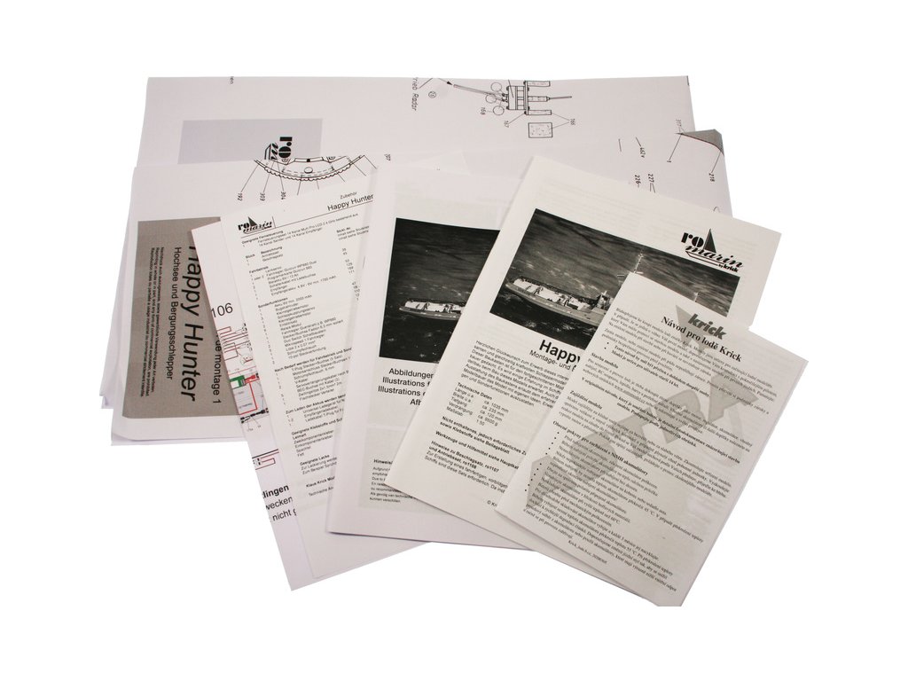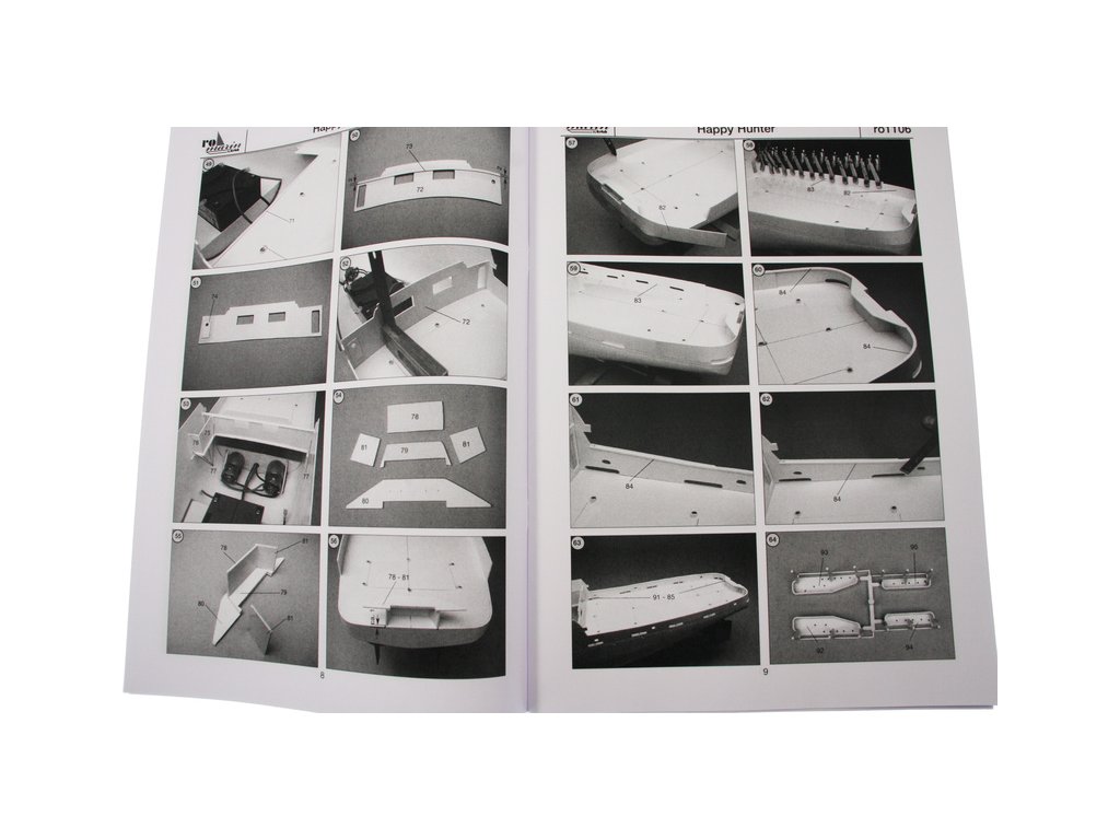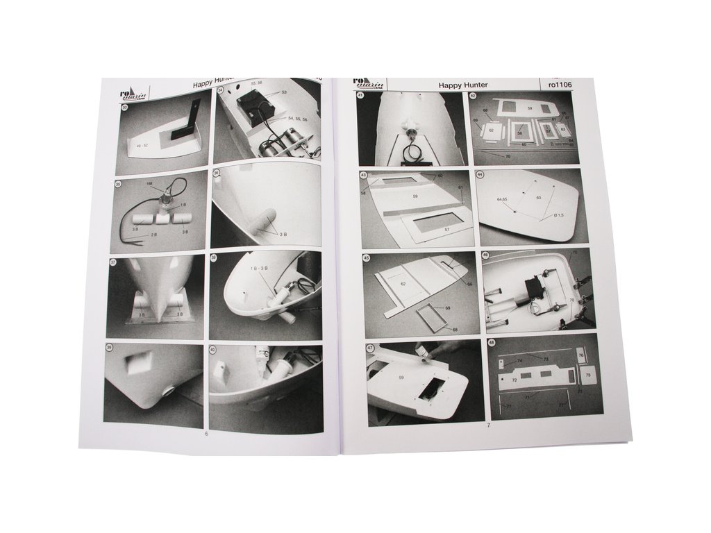 Stavebnice modelu lodi ROMARIN, Happy Hunter obsahuje plastové výlisky trupu, paluby a interiéru, výkresy 1:1, CNC překližkové a plastové výřezy, drobné plastové výlisky, montážní součásti, obtisky, návod pro provoz v češtině a obrázkový manuál DE.