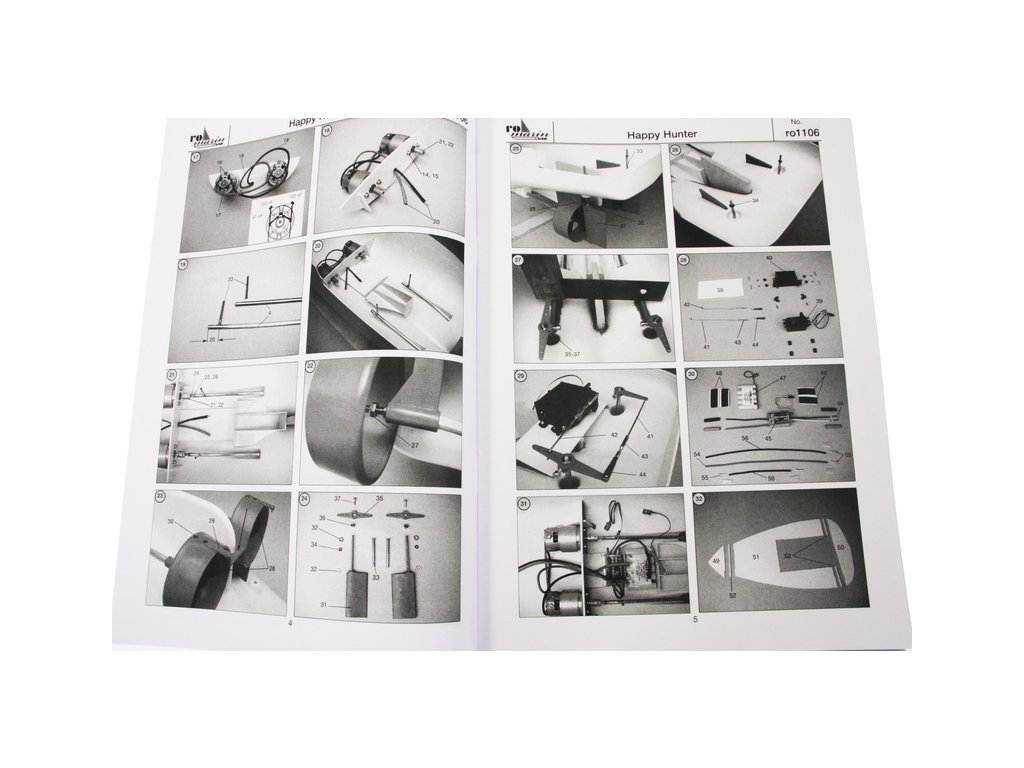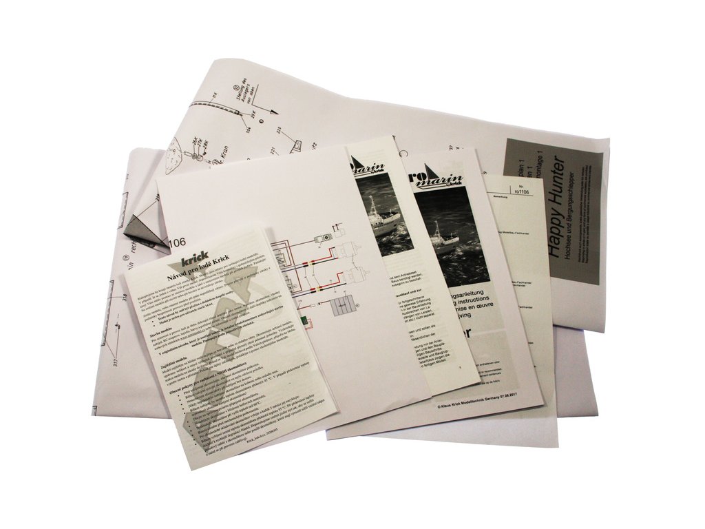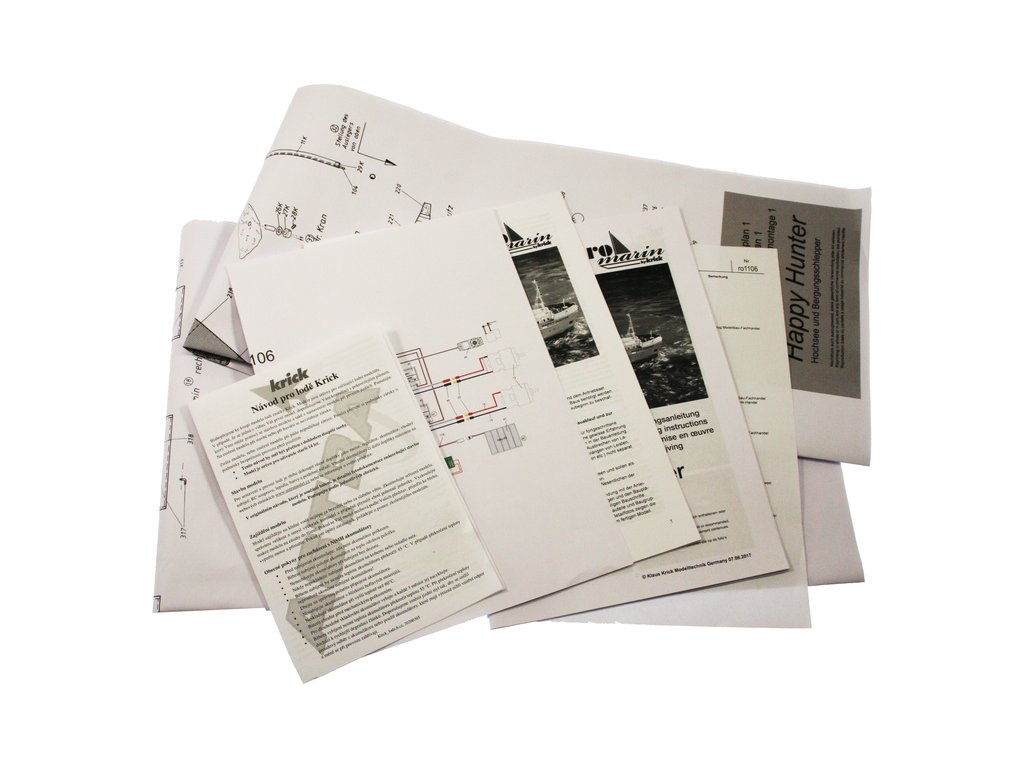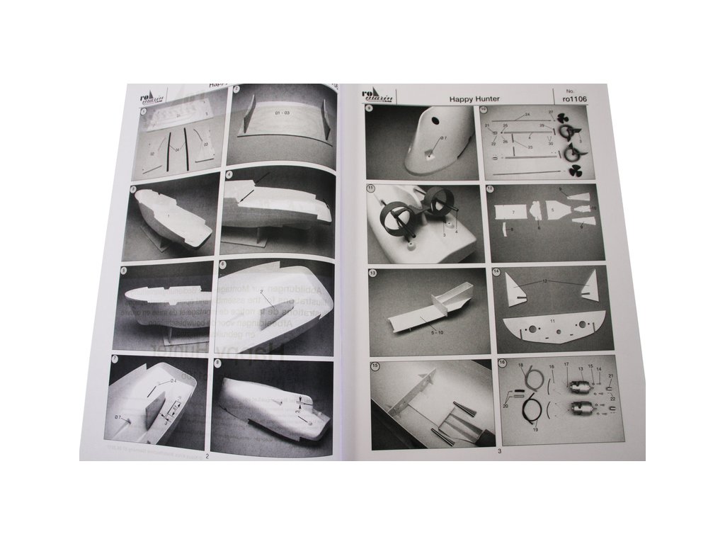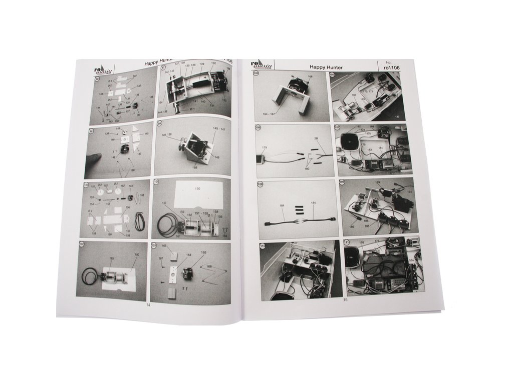 Stavebnice modelu lodi ROMARIN, Happy Hunter obsahuje plastové výlisky trupu, paluby a interiéru, výkresy 1:1, CNC překližkové a plastové výřezy, drobné plastové výlisky, montážní součásti, obtisky, návod pro provoz v češtině a obrázkový manuál DE.