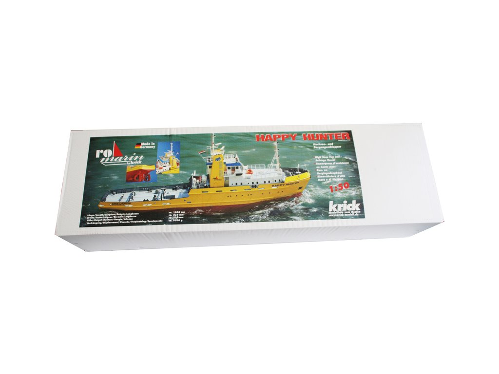 ROMARIN Happy Hunter kit je detailní replika holandského zaoceánského záchranného remorkéru v měřítku 1:50. Obsahuje plastové díly trupu, paluby a interiéru, dřevěné součásti, výkres, lodní šrouby a příslušenství. Zkušení modeláři mohou model vybavit volitelnými doplňky, jako funčními světly, radarem, lodní sirénou či tažným zařízením. Samolepící obtisky, vícedílný stavební návod a plán.