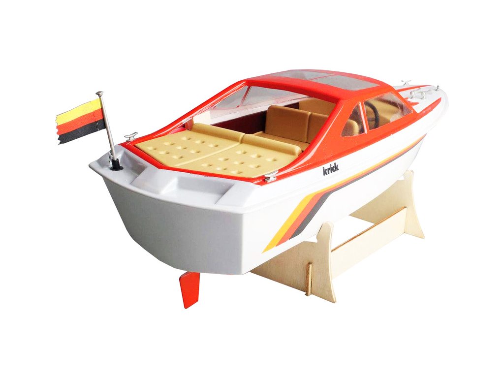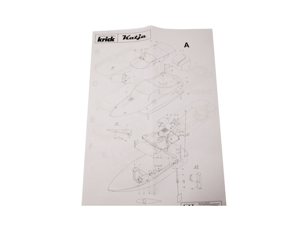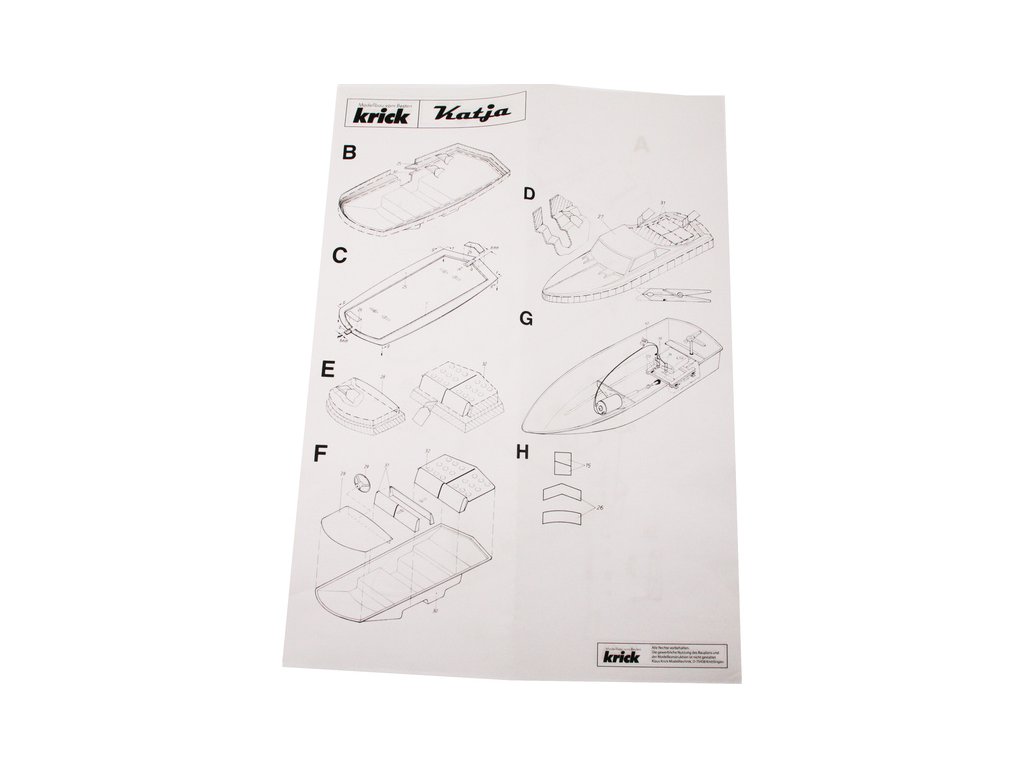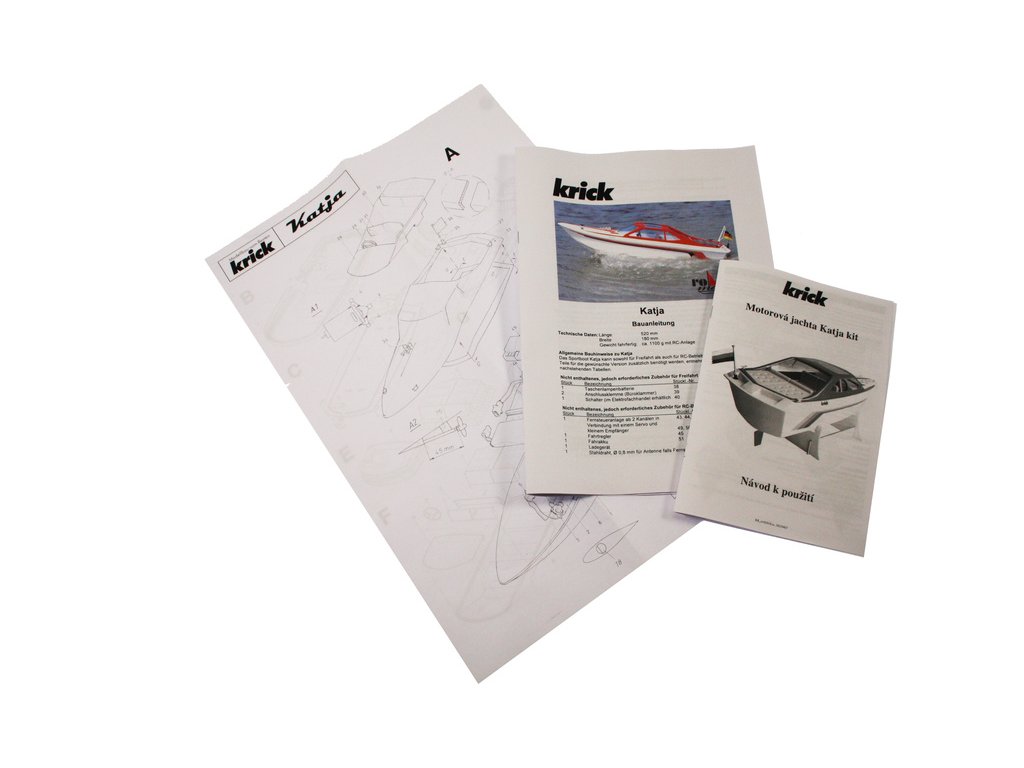 Stavebnice RC modelu elegantní čtyřsedadlové motorové jachty Katja, je určena pro začátečínající lodní modeláře. Obsahuje 7 plastových dílů, dřevěné díly na stojánek, motorové lože a pro uložení elektroniky. V balení je lodní šroub s hřídelí, kormidlo, volant, vlajka, samolepky a drobné příslušenství.