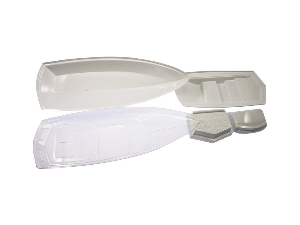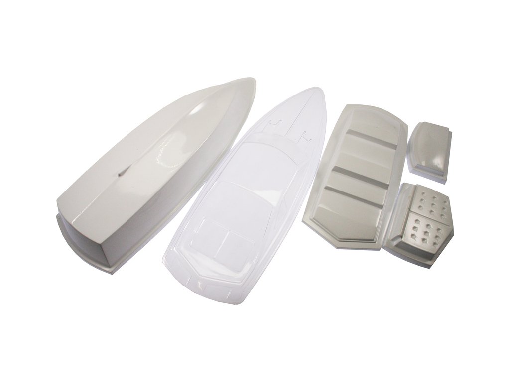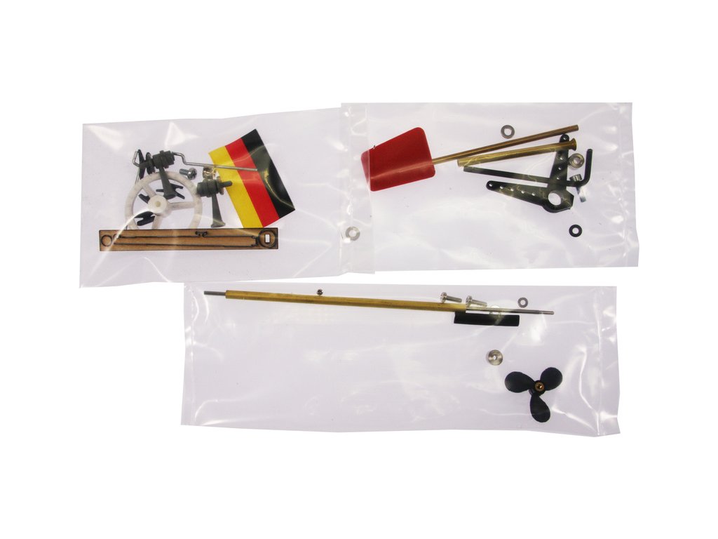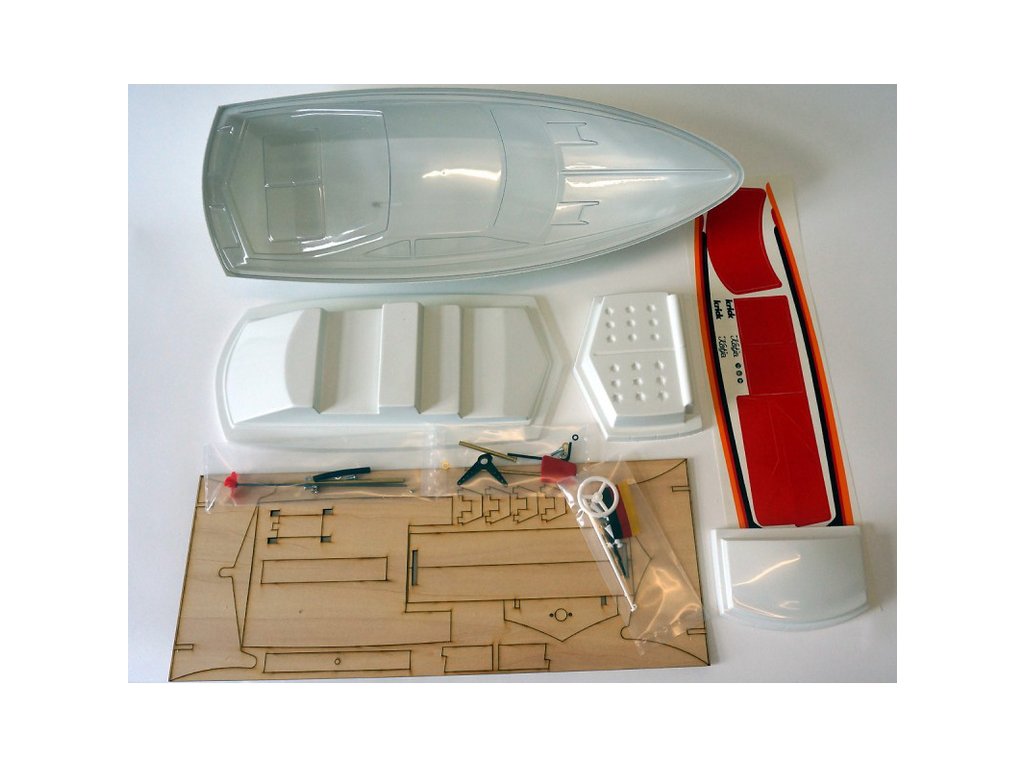 Výliseky trupu a paluby z ABS a čirého plastu, sada laserem řezaných překližkových dílů, lodní šroub s hřídelí, táhla, páka řízení, plastové maketové doplňky, montážní příslušenství, samolepky, návod v češtině, manuál DE, EN.