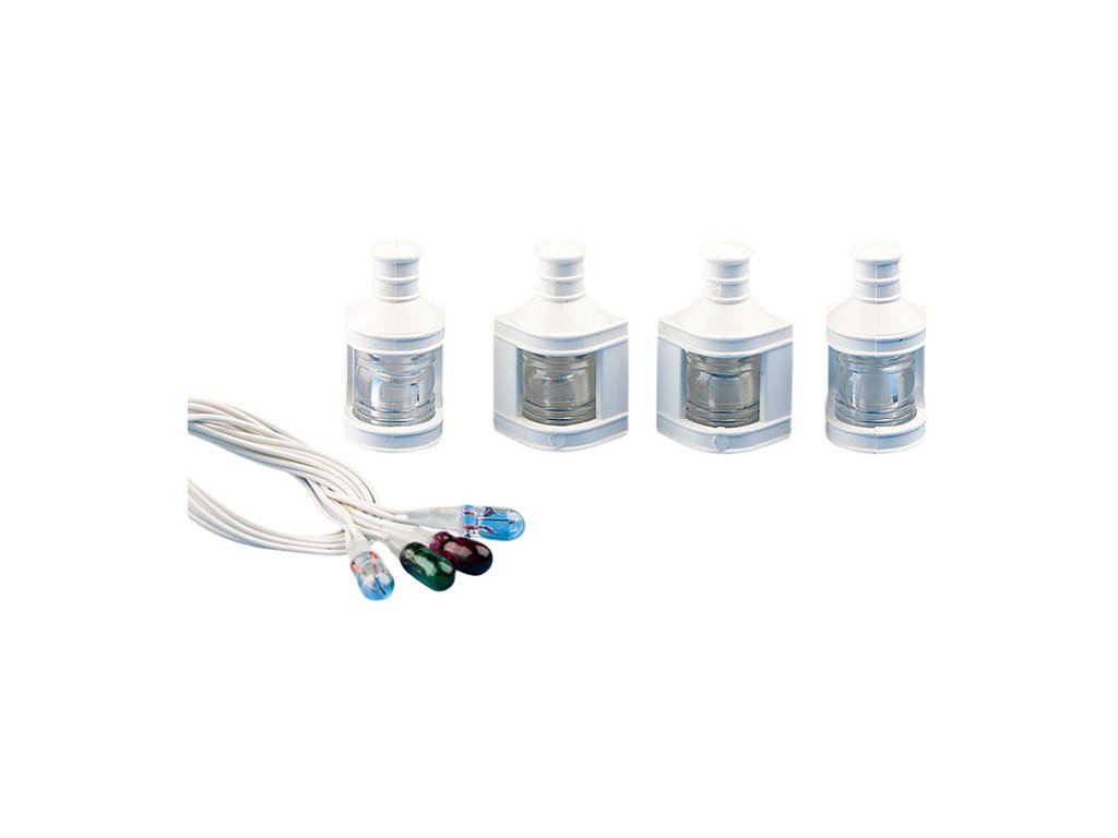 Poziční osvětlení pro realistický vzhled modelů lodí. Tato sada obsahuje dvě barevná poziční světla na levobok a pravobok a dvě horní světla. Plastové lampy se skládají z pouzdra lampy a průhledného skleněného těla, ve kterém je umístěna žárovka. Pro nátěr skříně lampy jsou vhodné akrylové barvy. Rozměry pouzdra lampy: 10x10x20 mm. Délka vodičů 100 mm.