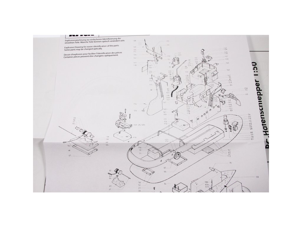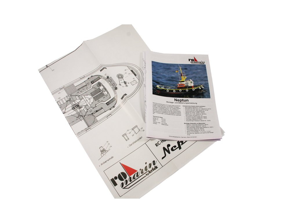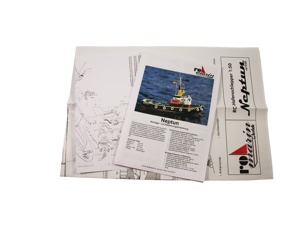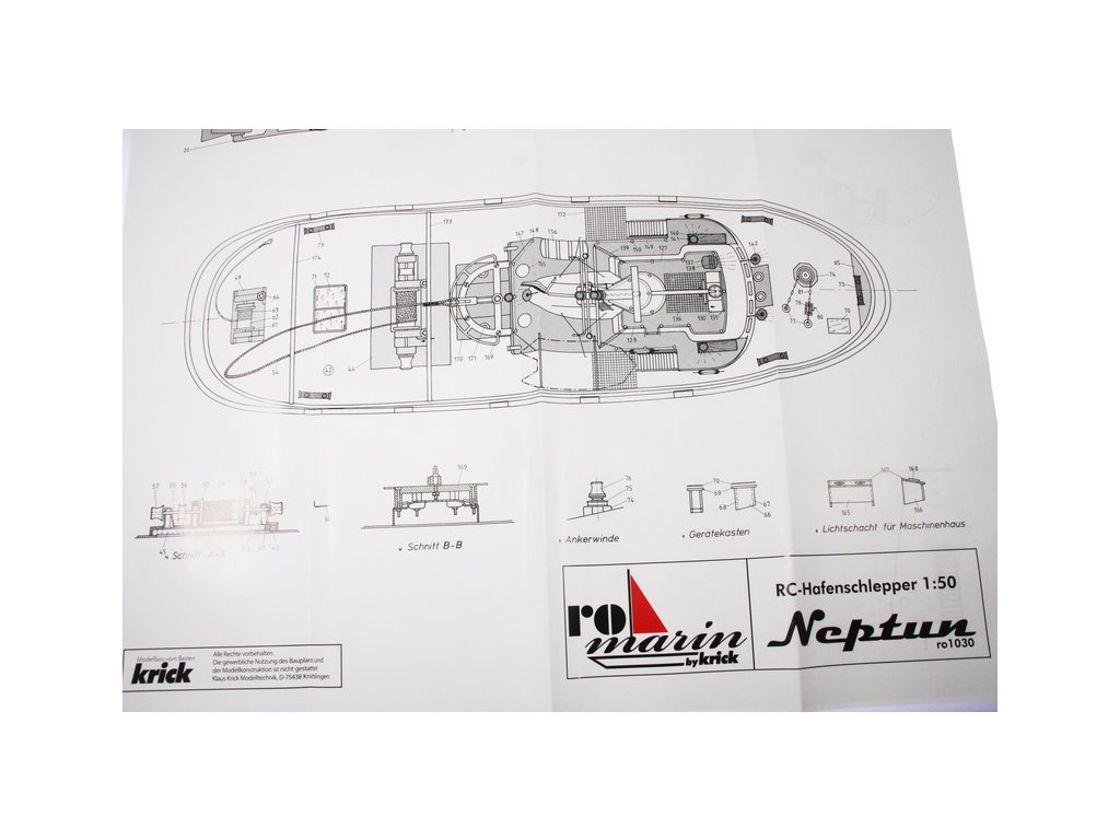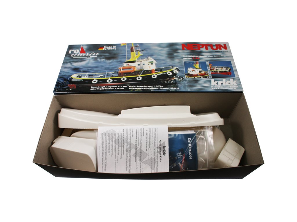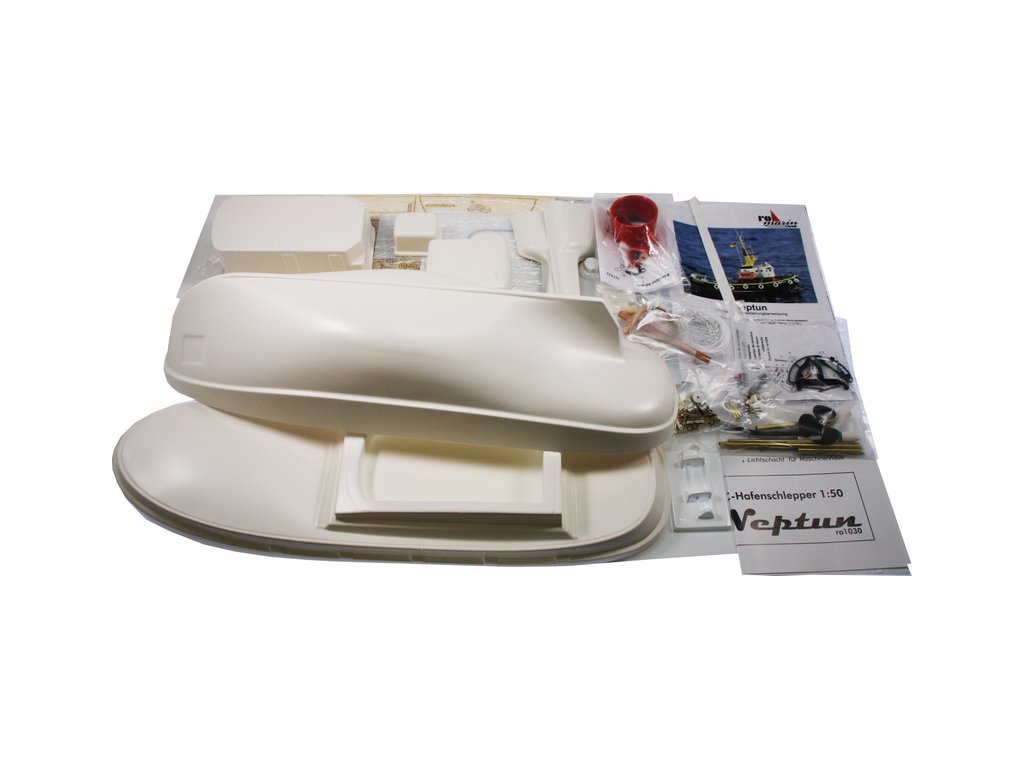 Stavebnice RC modelu lodi na dálkové ovládání od firmy ROMARIN, přístavní remorkér Neptun kit. Vzorem byl člun Bugsier Series v Hamburku. Obsahuje plastové díly trupu a paluby a interiéru, dřevěné součásti, výkres, lodní šroub s tunelem, maketové díly a drobné stavební příslušenství.